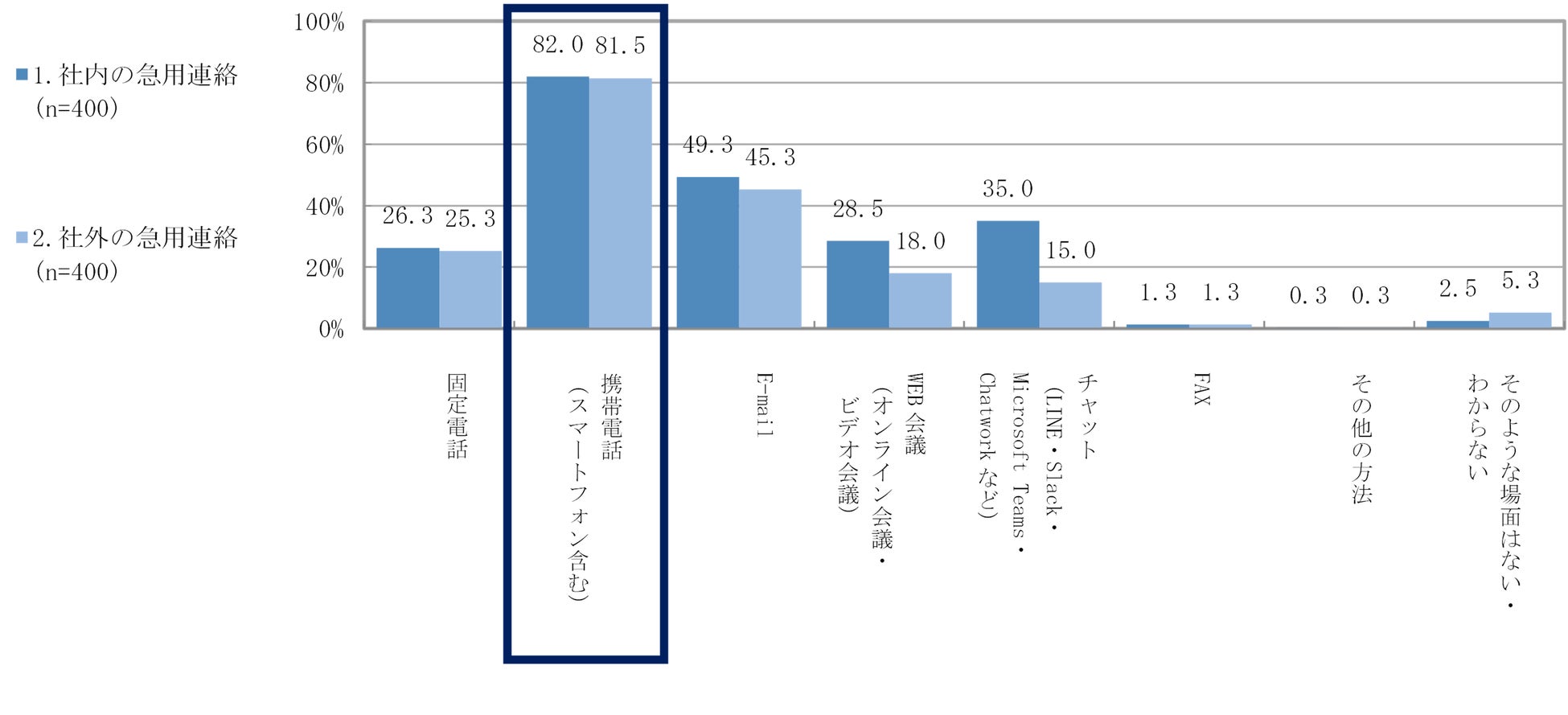 電話に代わるコミュニケーションツールの使用率が高まるものの、社内・社外の連絡における携帯電話(スマートフォン含む)の使用率が依然高く、緊急時は圧倒的に高い結果に。