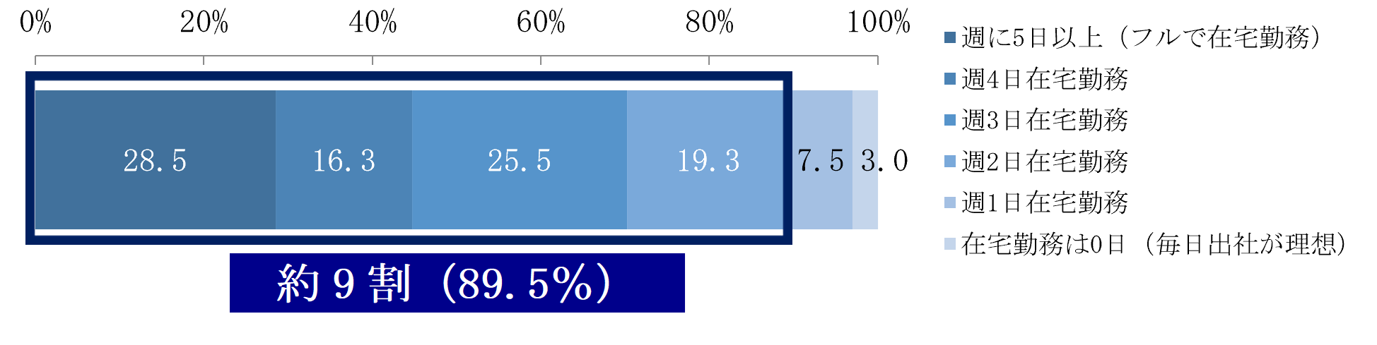 次に25.5%の方が「週3日在宅勤務」と回答し、約9割(89.5%)の方が「週2日以上の在宅勤務」を理想と考えています。2022年も引き続き在宅勤務を要望する会社員(正社員)が多いと考えられます。