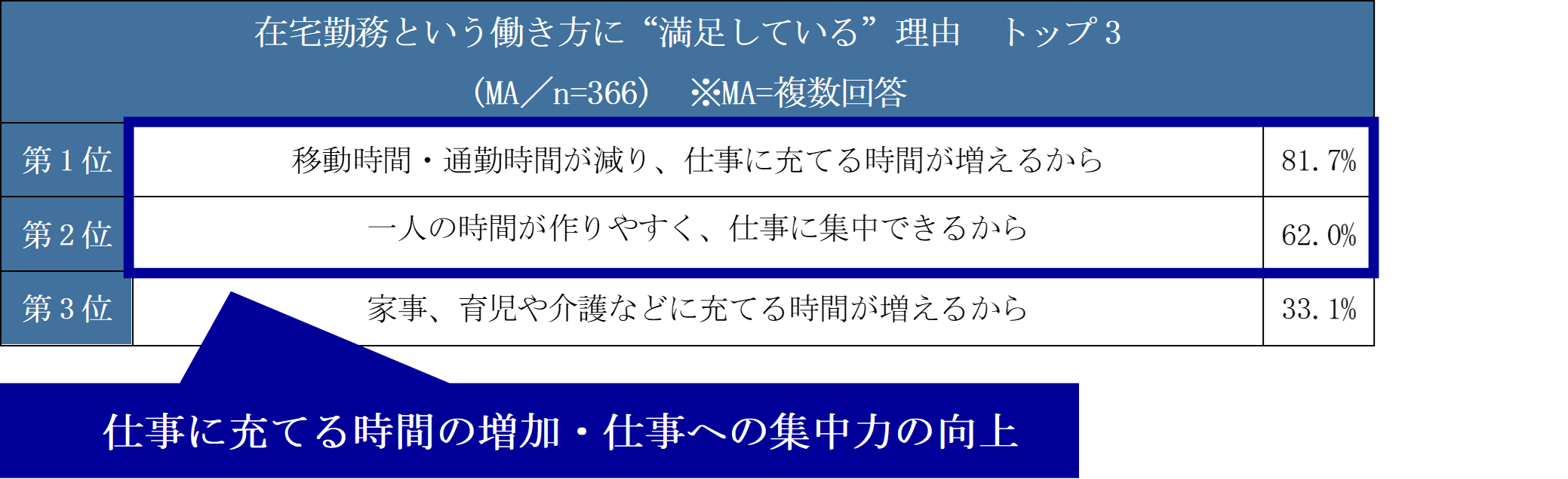 仕事に充てる時間の増加、仕事への集中力の向上など、仕事におけるパフォーマンス向上に繋がる回答が確認できます。