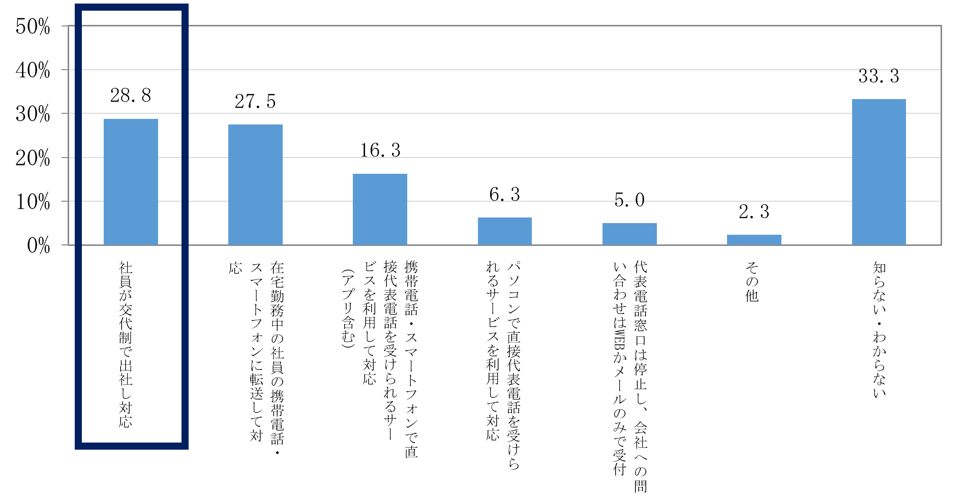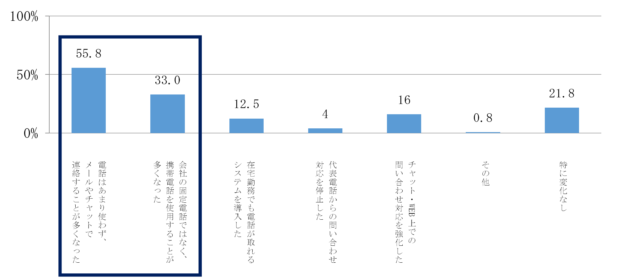 次に「会社の固定電話ではなく、携帯電話を使用することが多くなった」が約3割(33.0%)となり、特に変化なしの21.3%に続いて、「チャット・WEB上での問い合わせ対応を強化した」の割合が16.0%となりました。
