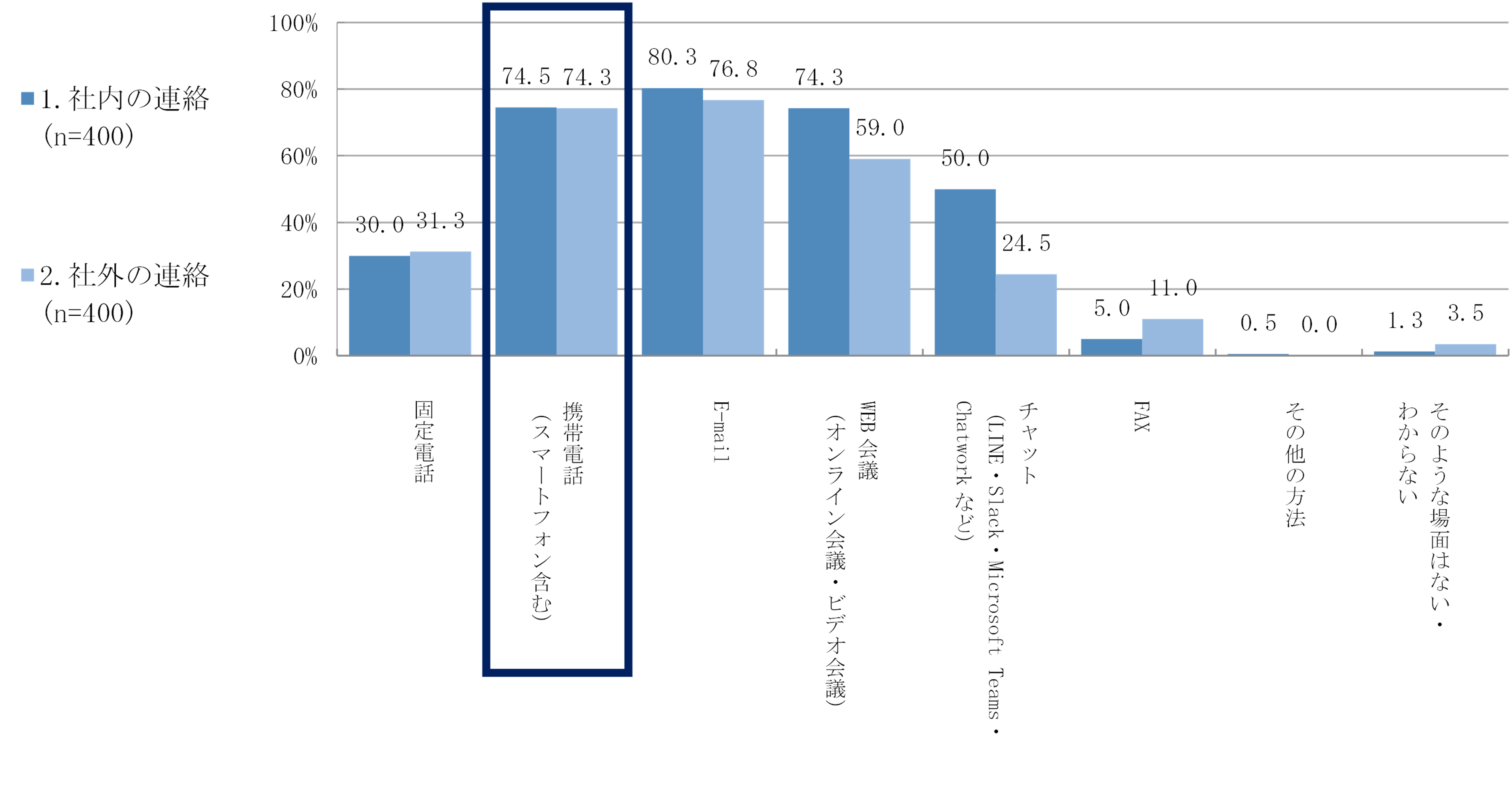 次に、携帯電話(スマートフォン含む)の使用率が高く、「社内の連絡」において74.5%、「社外の連絡」で74.3%となっています。