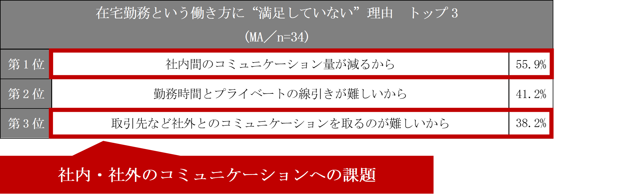 一方、在宅勤務において「満足していない理由」は、「社内間のコミュニケーション量が減るから」がトップとなり、次は「勤務時間とプライベートの線引きが難しいから」でした。