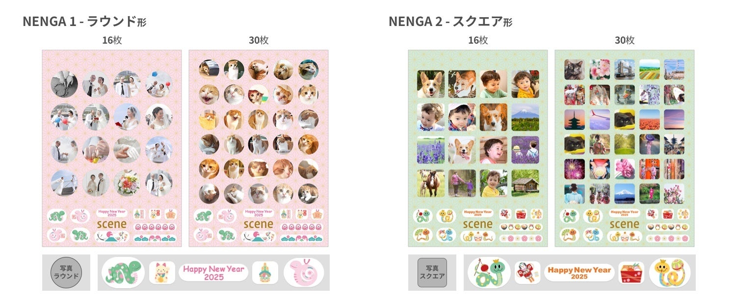 Sceneアプリから注文できる季節限定販売の「年賀フォトシール」は、台紙部分に干支や吉祥文様を描いた特別なデザインで、イラスト部分もはがして貼ることができる年賀状向けのシール商品です。