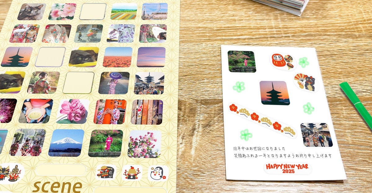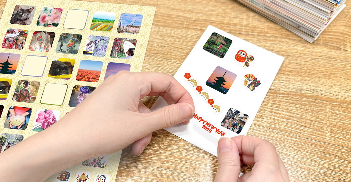 年賀フォトシールを使えば、市販の無地年賀状に貼るだけで、誰でも簡単に華やかな年賀状を作成できます。