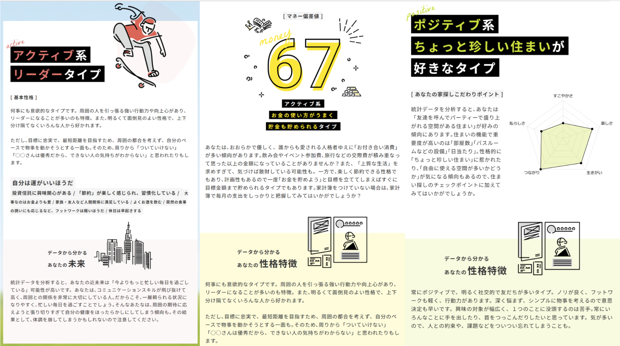 「質問:世話好きなほうだと思う」「答え:はい、どちらでもない、いいえ」や、「質問:数字やデータを根拠に話をするタイプだ」「答え:はい、どちらでもない、いいえ」などの簡単な20問の質問を答えるだけで、基本性格の分析や傾向、お金の使い方の傾向、データから分かる近未来、家探しポイントなどが分かります。