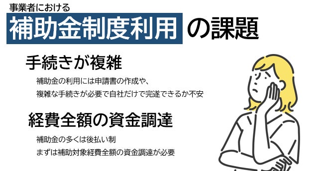 多くの補助金制度は後払い制であり、まずは自社で補助対象事業の経費全額分の資金を用意する必要があり、特に中小事業者様においては補助金制度の利用が難しいという社会的な課題があります。