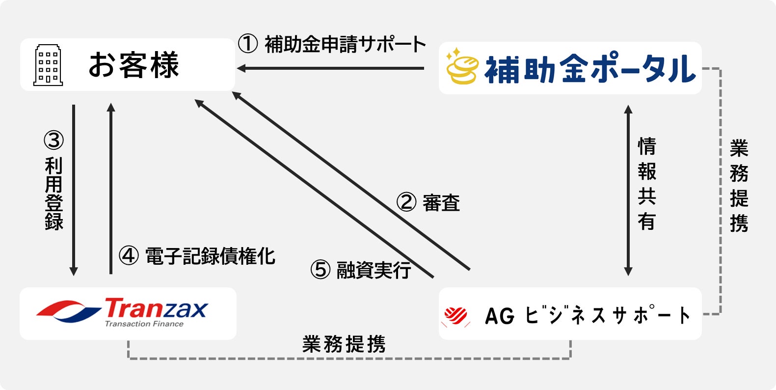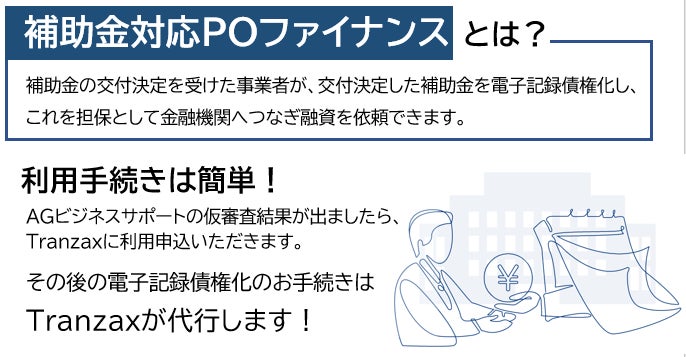 アイフル株式会社(本社:京都府京都市、代表取締役社長:福田 光秀)のグループ会社であり、全国の法人・個人事業主様の「頼れるパートナー」として資金面から事業をサポートするAGビジネスサポート株式会社(本社:東京都港区、代表取締役社長:吾妻 弘 以下、AGビジネスサポート)は、株式会社補助金ポータル(代表取締役社長:福井 彰次 以下、補助金ポータル)との業務提携範囲を拡大し、2023年5月18日よりTranzax株式会社(本社:東京都港区、代表取締役社長:大塚 博之 以下、Tranzax)がサービスを提供する「補助金対応POファイナンス」の販売を開始しました。