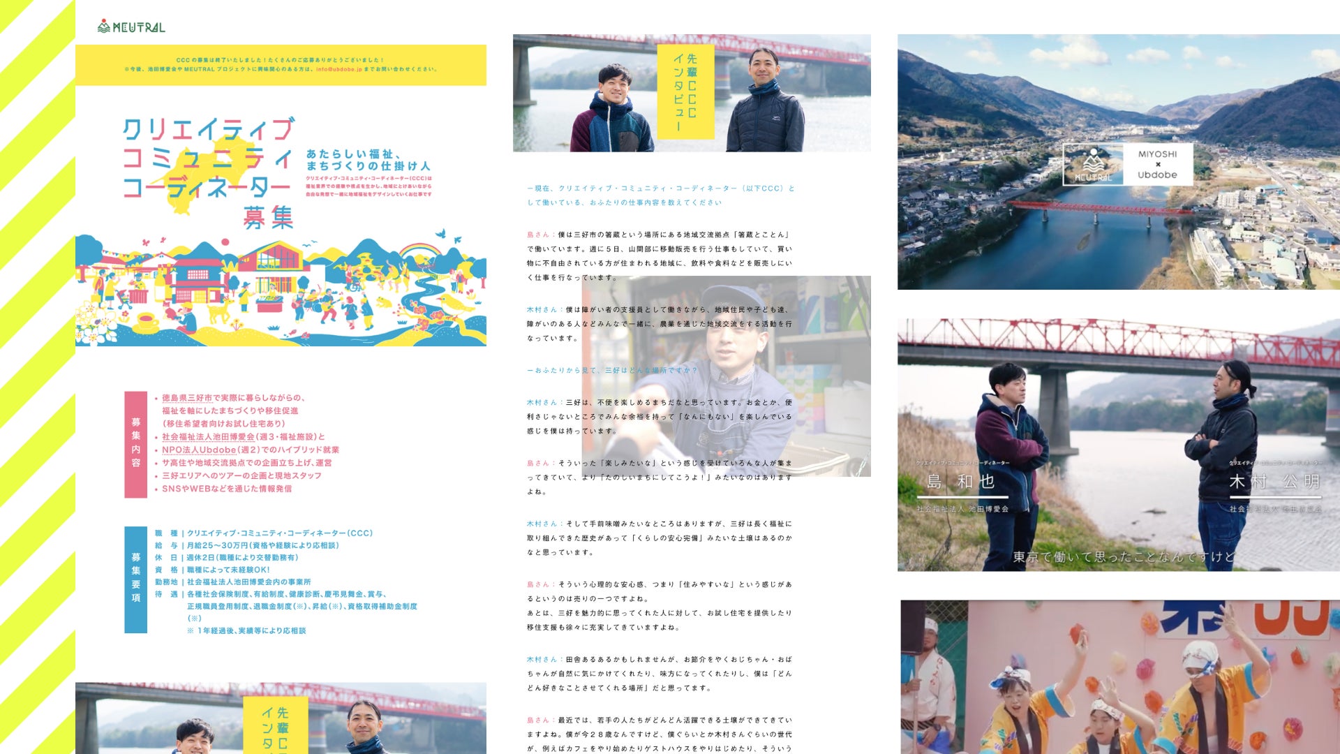 徳島県の山間部、三好市の社会福祉法人池田博愛会の採用ブランディング。地域と繋がる福祉職をクリエイティブコミュニティコーディネーターと名付け、福祉職の新しい働き方として、NPO法人UbdobeがブランディングとPRを実施しました。
