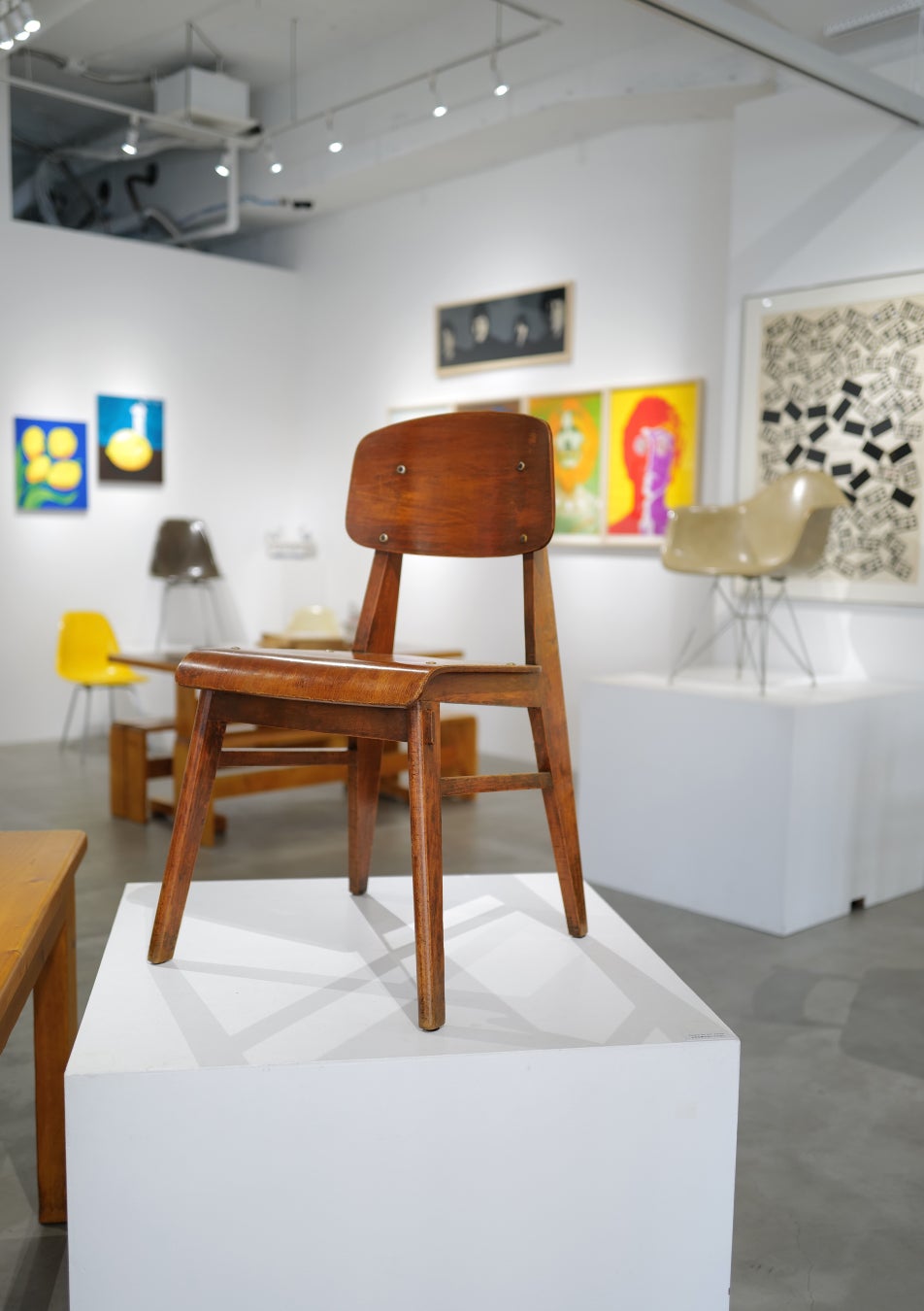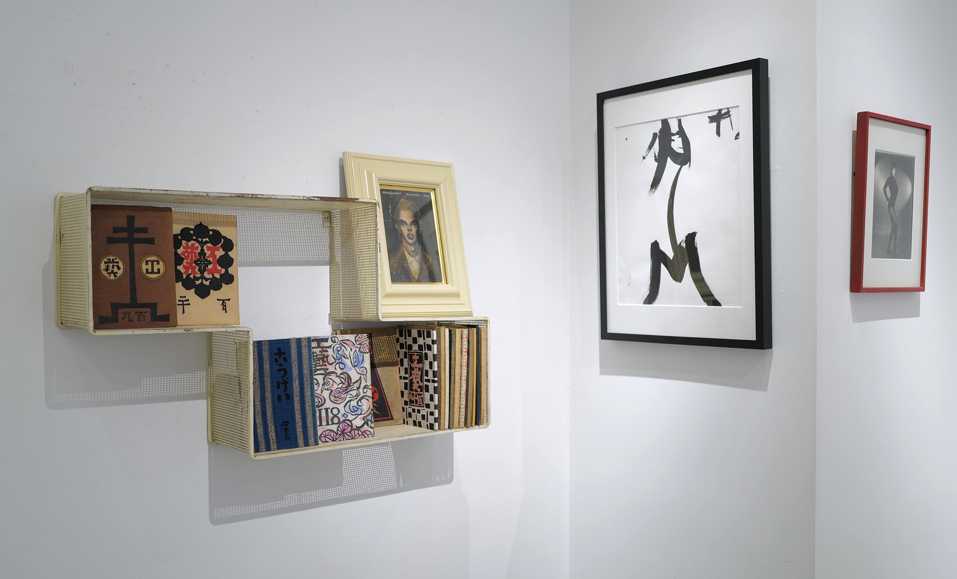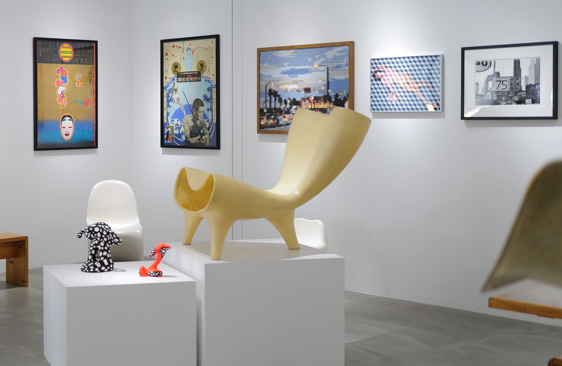 ギャラリストでありアートピースのコレクターでもあるティエリー氏がセレクトした、ミッドセンチュリーの巨匠たちによるスツールや椅子、テーブルといったヴィンテージ家具に対し、小宮山書店で取り扱う同年代のヴィンテージポスターや、エアブラシによるフェティッシュな作品、柳宗悦が創刊し芹沢銈介等が装幀を手掛けた雑誌『工藝』(1931-1951)、現代のセラミック作品などをあわせることで、それぞれの美しさが呼応し、新たな魅力を放ちます。