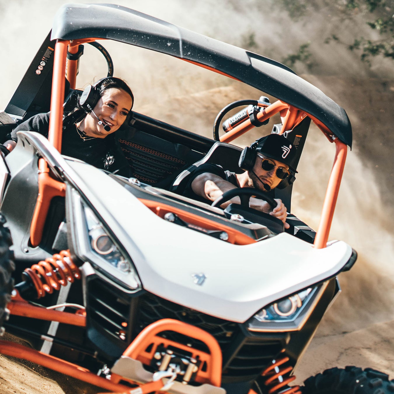 ATV/UTVなどオフロード用バギーにて、煩雑な無線通話システムを取り付けることなく、インタラクティブかつ安全な会話を楽しめます。