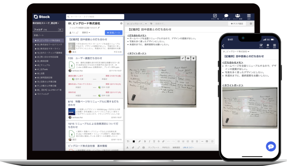 『Stock』は、ITに詳しくない65歳以上の方でもすぐに使いこなせるほどのシンプルさを徹底追求したツールです。「ノート」を起点に、作業依頼・議事録・問い合わせ管理といった業務情報を一元化できるほか、「タスク設定」や「メッセージ機能」も直感的に操作可能。情報の分散や煩雑化を防ぎ、誰でも迷わず活用できる環境を提供します。