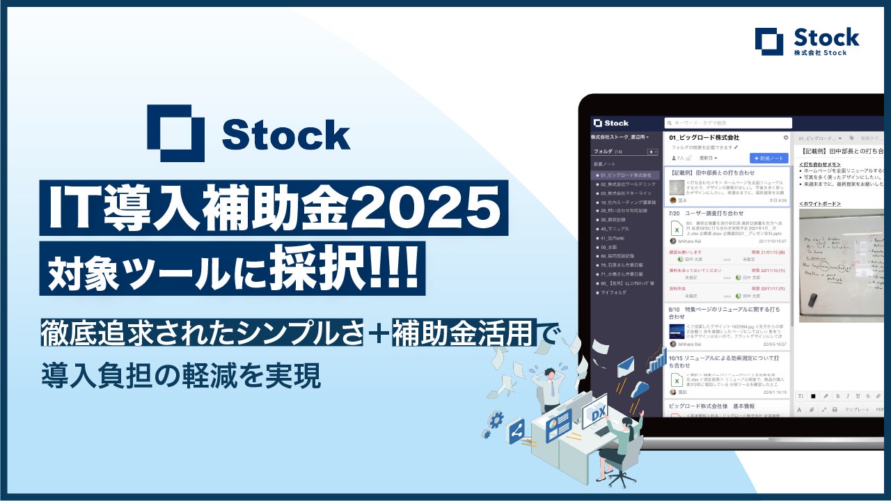 株式会社Stock(代表取締役社長:澤村 大輔、本社:東京都中央区、以下、当社)は、当社が提供する情報共有ツール『Stock』が、経済産業省が推進する「IT導入補助金2025」において“通常枠”の対象ツールに採択されたことをお知らせします。これにより、非IT企業を中心とする多くの企業様の情報共有のストレスを取り除くための体制が強化されます。