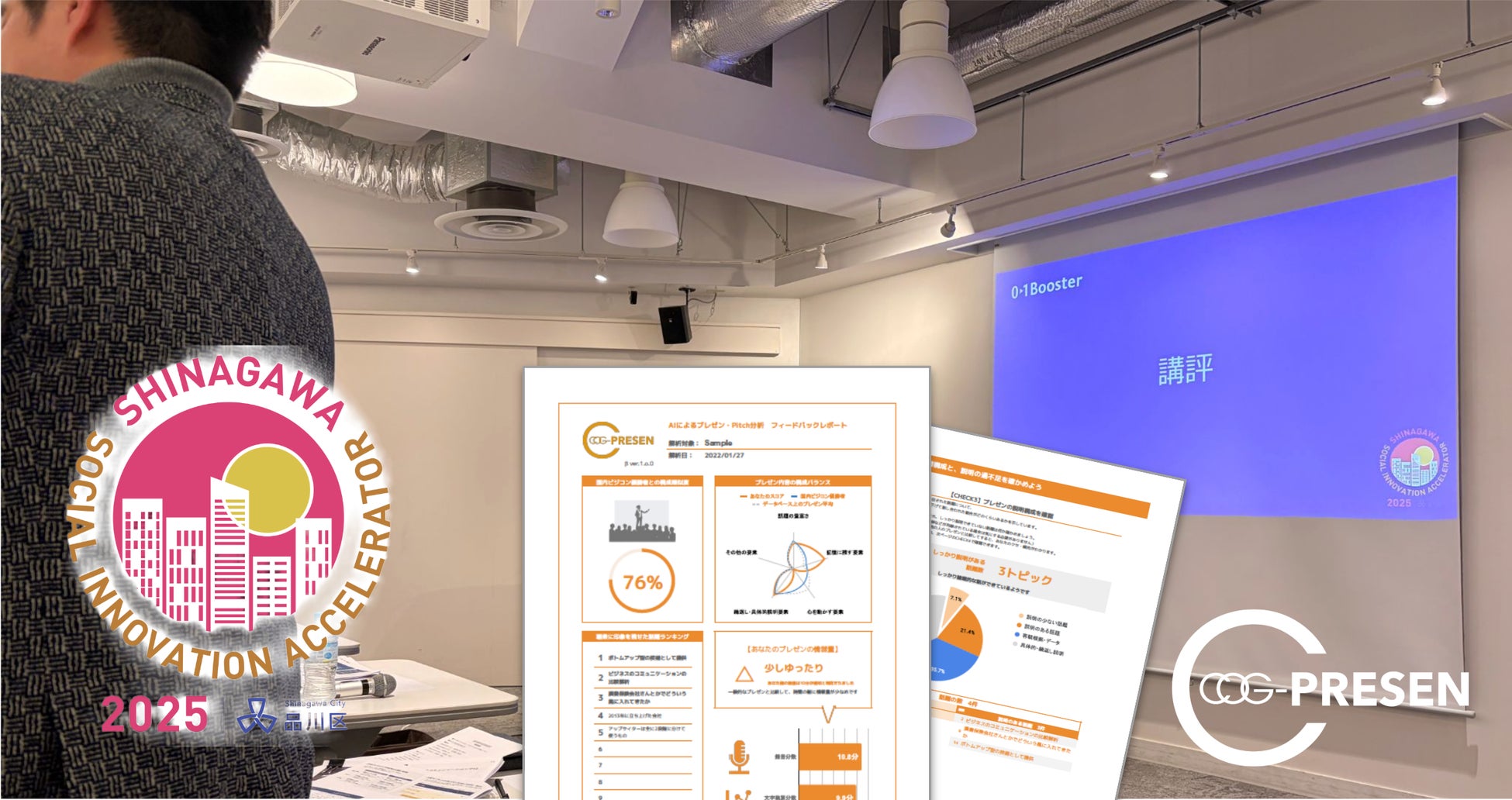 定性情報の定量化技術で、組織の意思決定基盤を提供するコグニティ株式会社(本社:東京都品川区、代表取締役:河野理愛、以下「コグニティ」)は、「品川ソーシャルイノベーションアクセラレータ2025」中間報告会(2026年1月21日、品川産業支援交流施設SHIP)にて審査員として講評を行うとともに、登壇したPitch(ピッチ)を、当社Pitch分析ソリューション「COG-PRESEN」で分析し、後日、会場・オンラインのハイブリッドワークショップ形式で改善フィードバックを提供します。なお当日の登壇者は10名で、分析・フィードバックは希望者9名を対象に実施します。