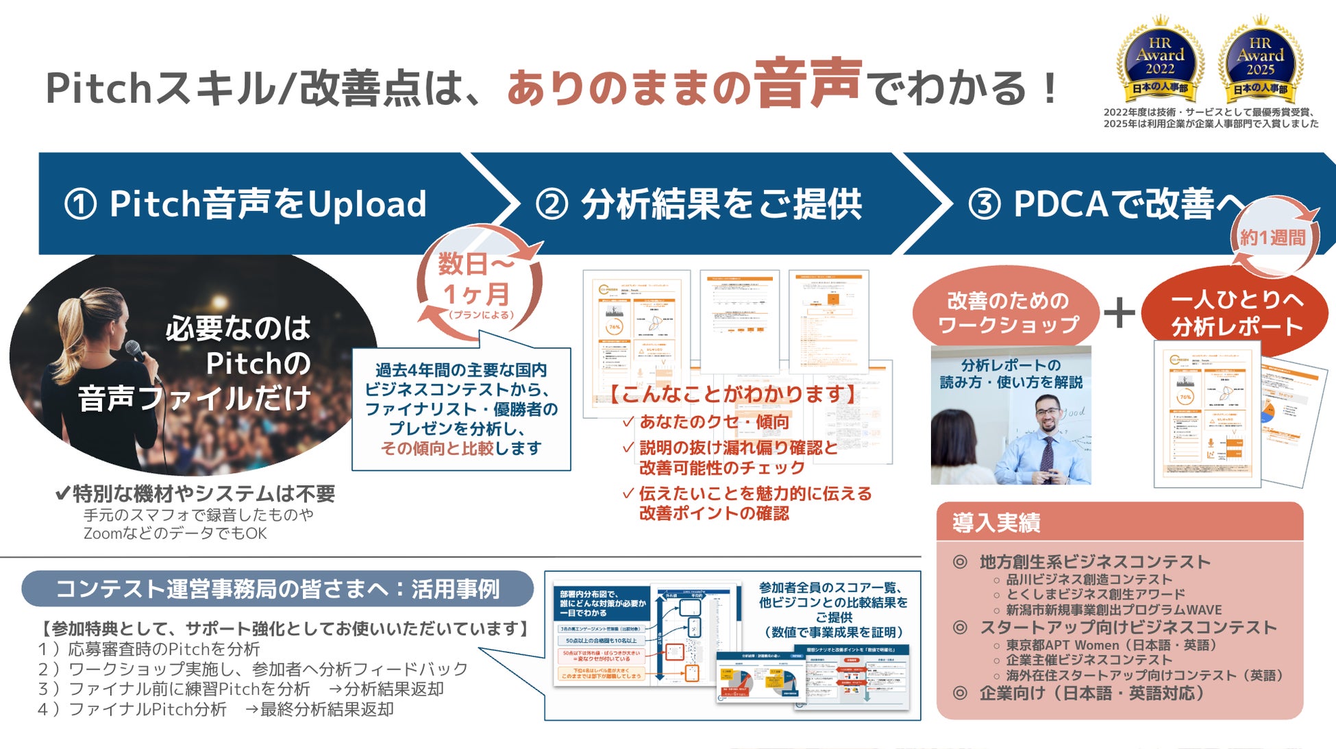 今後も、自治体・企業・大学等が運営する各種アクセラ/ビジネスコンテストに対し、「登壇者の改善に直結するフィードバック」として分析提供を拡大してまいります。