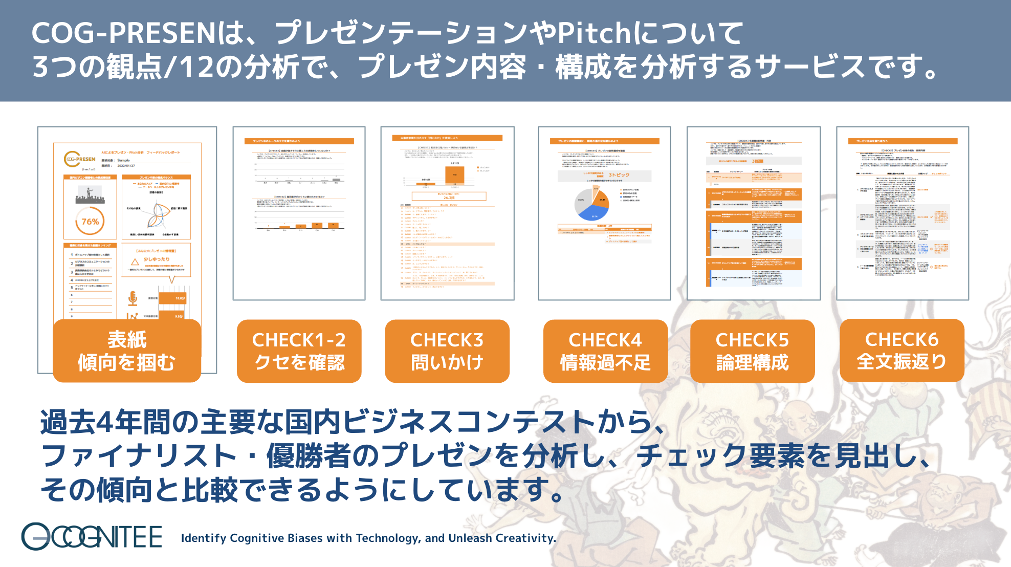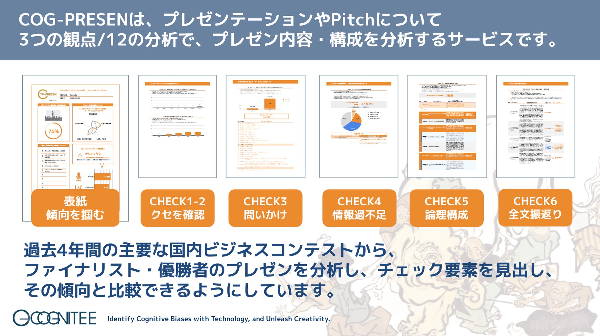 Pitchやプレゼンテーションを対象とした「COG-PRESEN」は、過去の優秀なPitchを分析し、それと比較できる分析・検定ツールです。