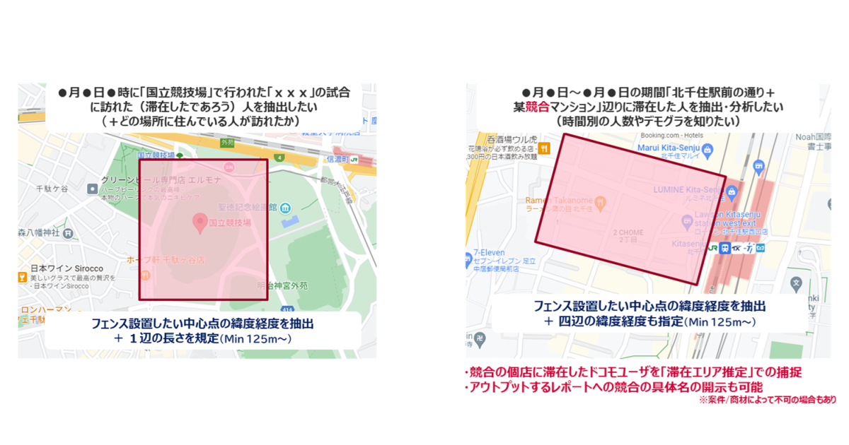今回提供を開始した「商圏分析×ドコモ広告」では、ドコモの独自AIエンジン「docomo Sense™」の拡張機能を活用し、ユーザー同意のもと、対象エリアに居住しているユーザーや該当店舗へ来訪しているユーザーを分析することにより、現状のユーザー像を可視化することが可能です。