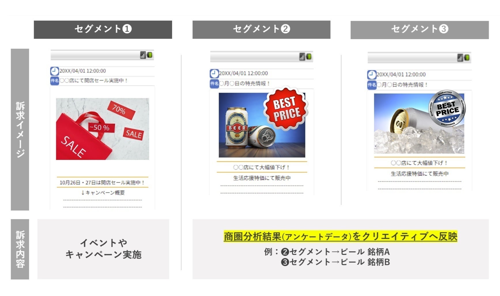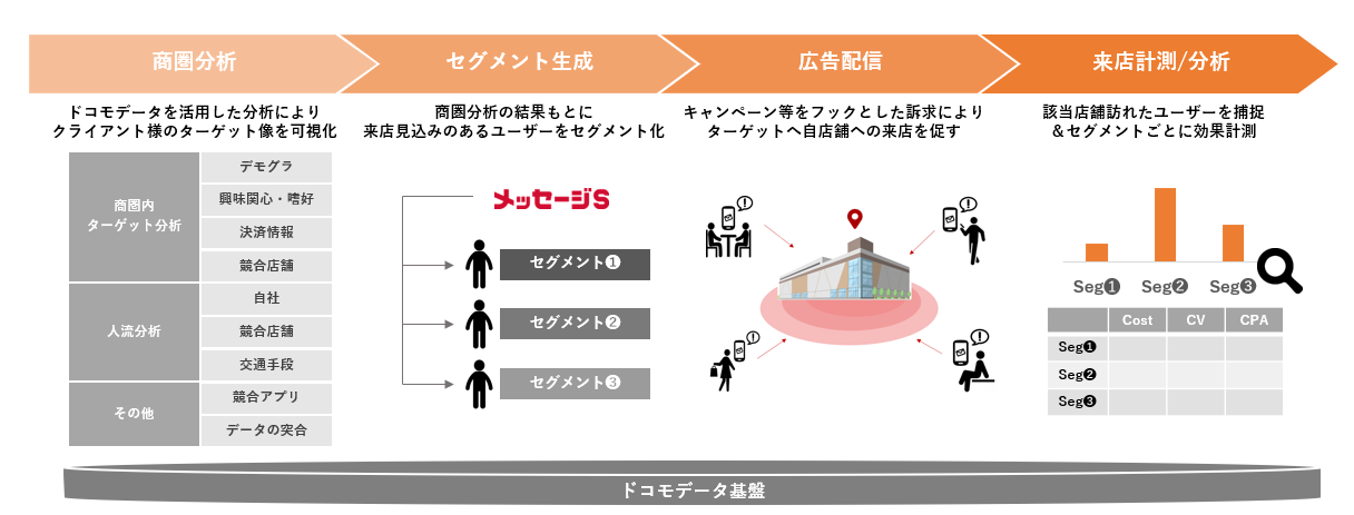 さらに、分析したユーザー群をもとにセグメントを生成し、セグメントに沿った複数のクリエイティブを、スマートフォン向け メール型広告サービス「メッセージS(スペシャル)®<以下、メッセージS>」※によって出し分けて配信することで、ユーザーの趣味・嗜好に適した訴求で来店を促すことができます。そして、ユーザー同意のもと取得したスマートフォンの位置情報より、該当店舗へ来訪したユーザーを捕捉することで、広告効果の計測(※1)を実施するなど、商圏地域に居住するユーザーを効率的に獲得していく事が可能となります。