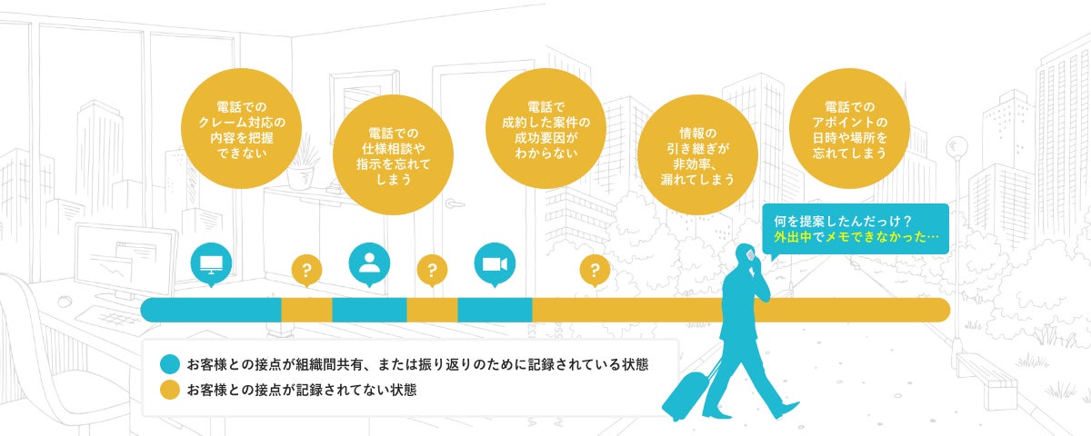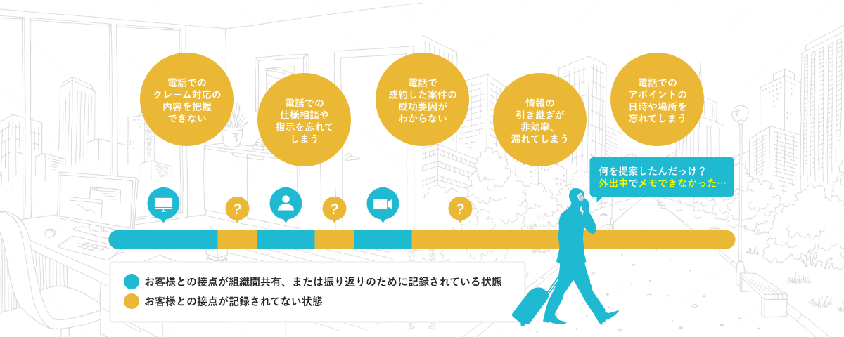 一方で、商談後の追客や、関係性を築けた取引先との連絡手段として「社用携帯」が多く利用されており、社用携帯で会話した内容がブラックボックスになっているという課題が残り続けています。