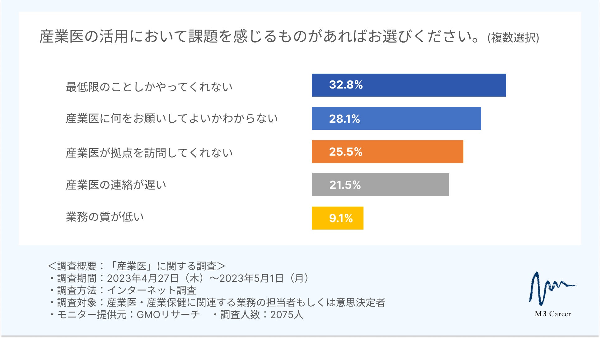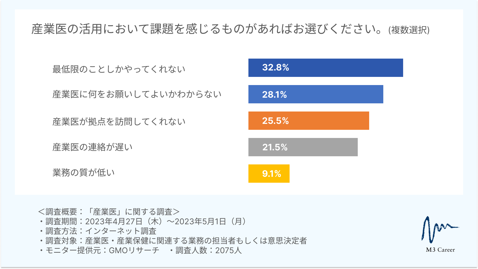 また、産業医の活用課題については「最低限のことしかやってくれない」「何をお願いしてよいかわからない」が6割となり、産業医に気軽に相談できる関係性を作れていないことがわかります。