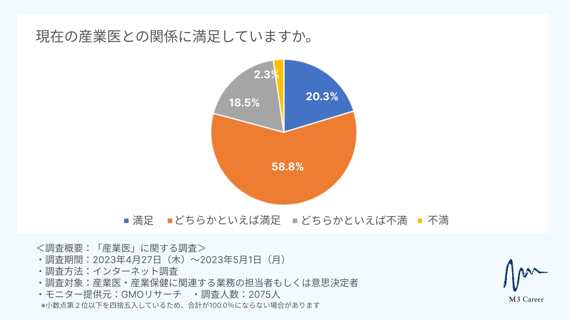 産業医との関係性については、8割が満足、2割が不満という結果が出ています。