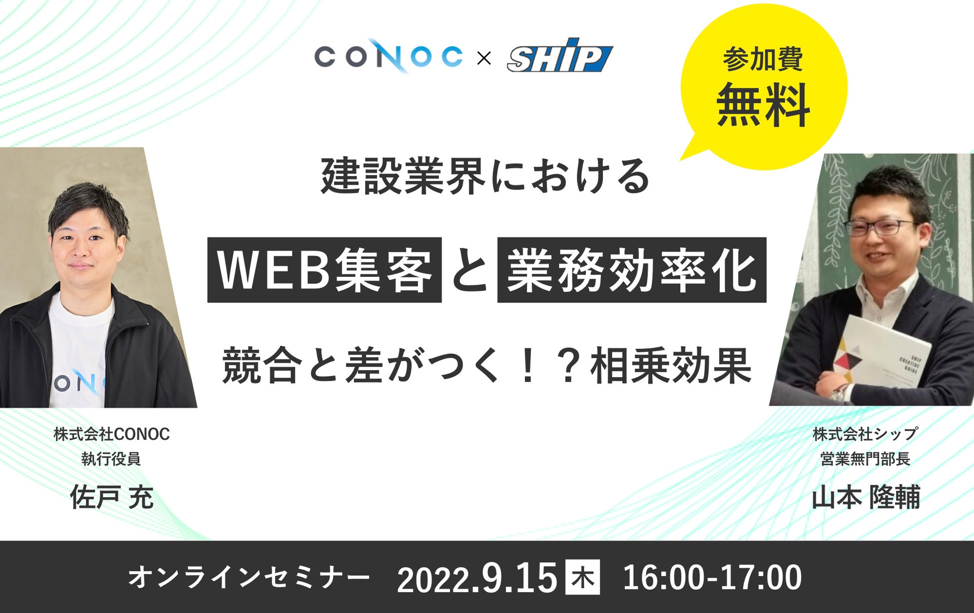 株式会社CONOC(本社:東京都渋谷区、代表取締役:山口一、以下CONOC)は、株式会社シップ(本社:東京都文京区、代表取締役:小松信幸、以下シップ)と共催で、2022年9月15日(木)に無料オンラインセミナー「WEB集客と業務効率化!競合と差がつく相乗効果とは」を開催いたします。