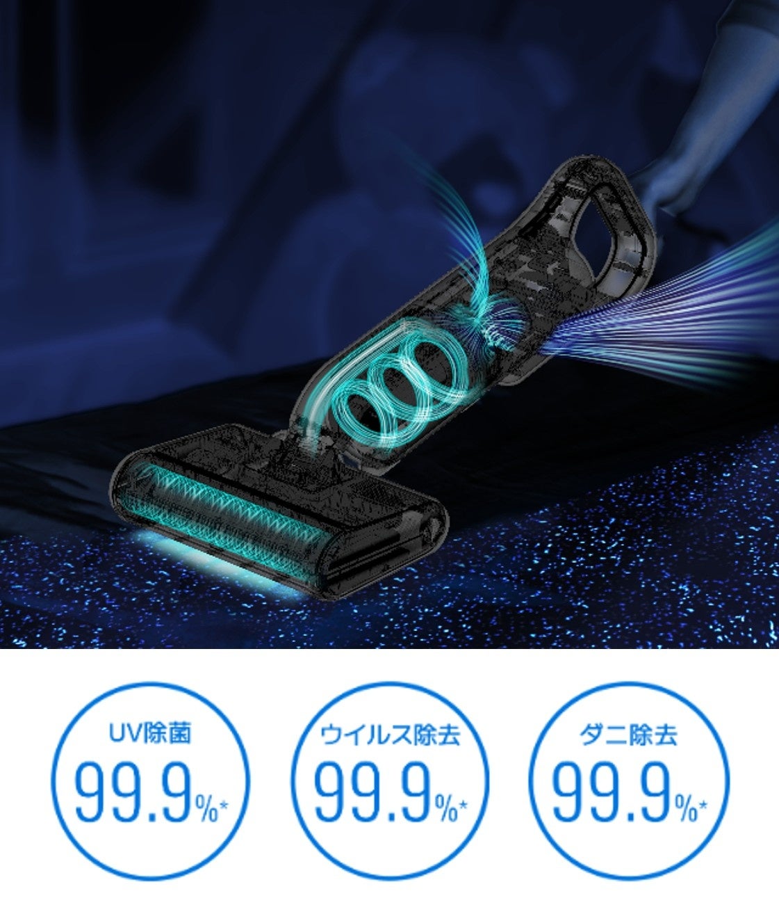 「温風」+「UV」+「たたき」+「吸引」で、99.9%の UV除菌・ウイルス除去・ダニ除去*1