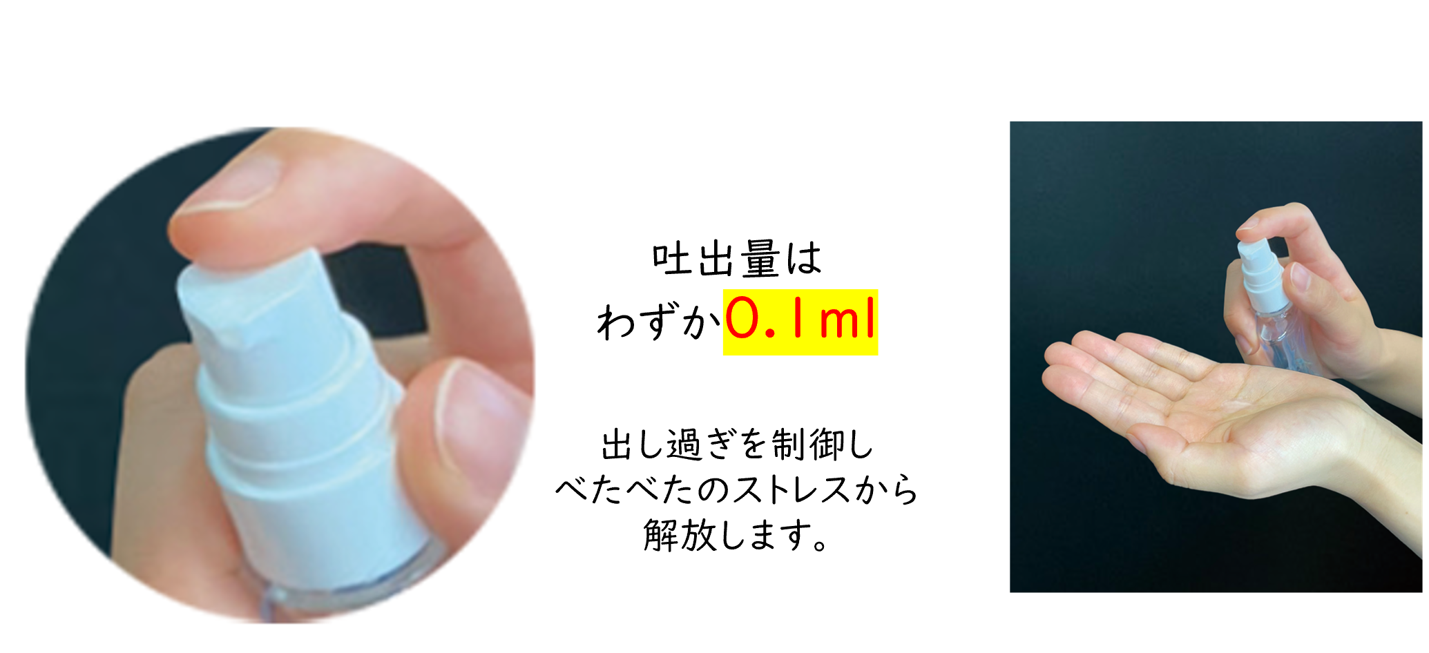 本商品は、最適な量を調整できる極小吐出になっています。1プッシュあたり0.1mlと微量調整が可能になるため、出し過ぎを制御し、一人ひとりに合った適量を塗布できます。