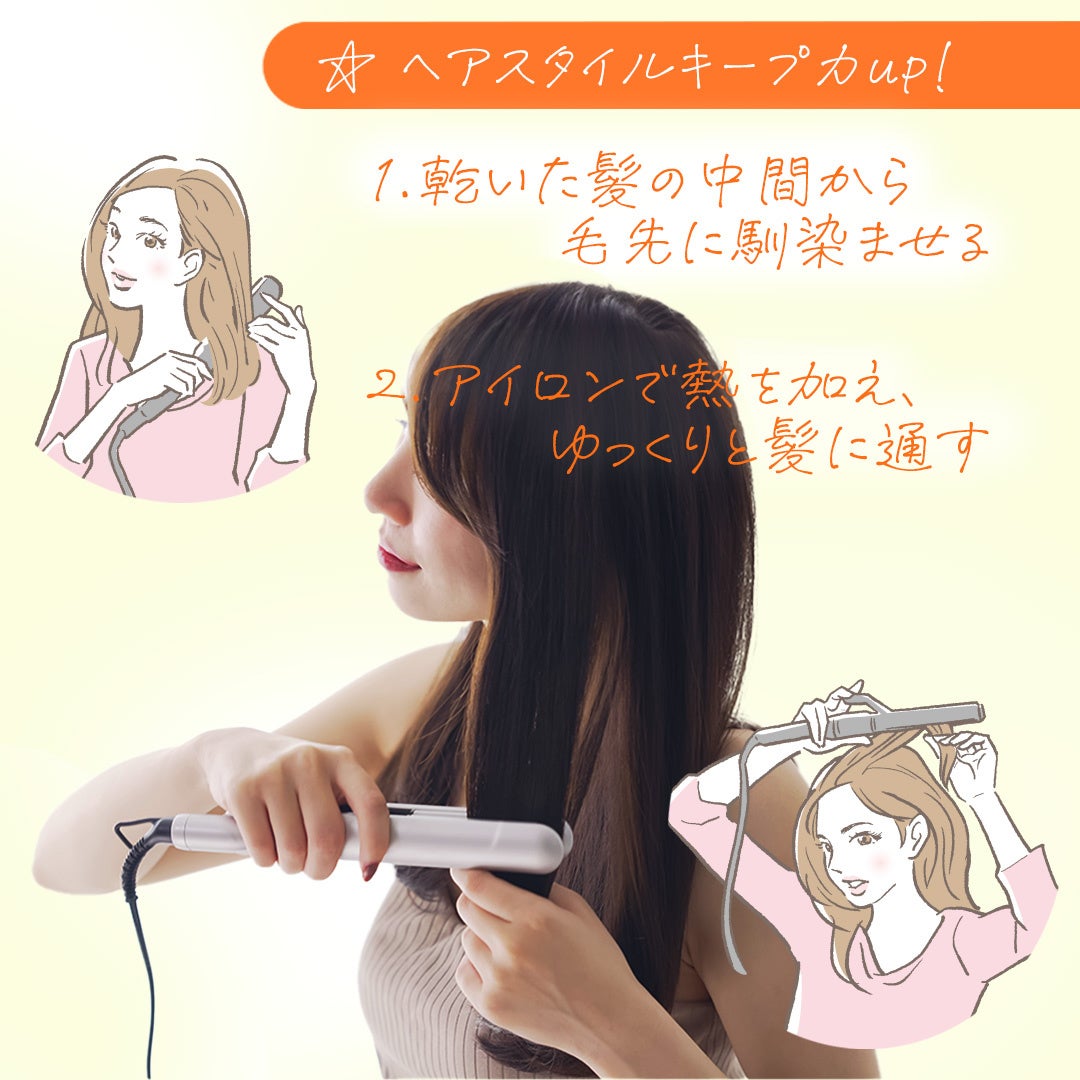 髪の根元から毛先にかけてストレートまたはカールアイロンで熱を通すことで、キープ力がより高まります。