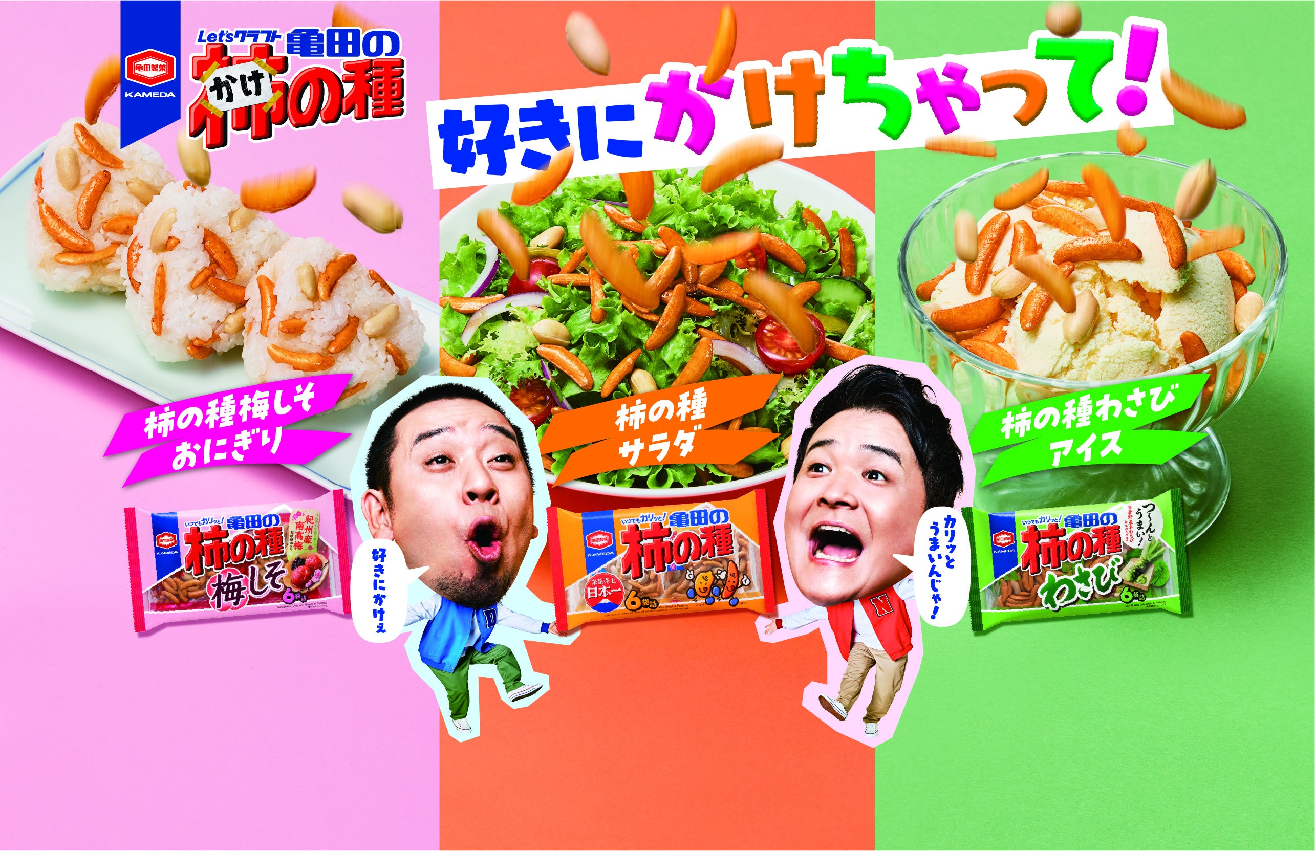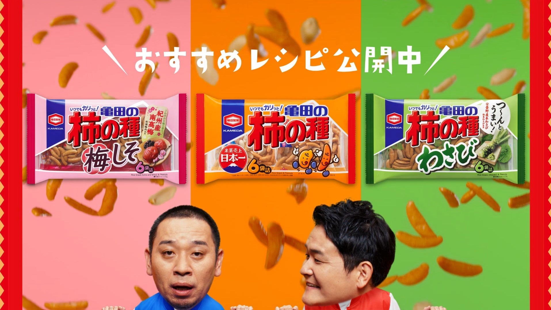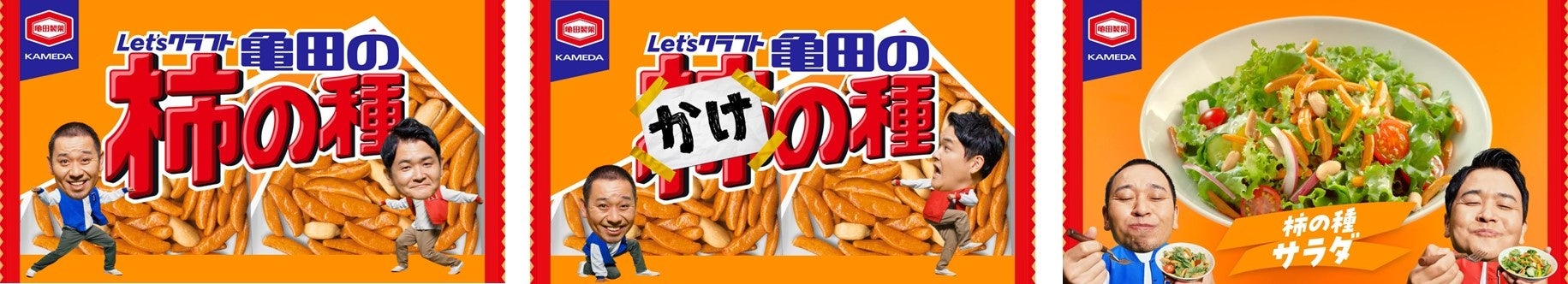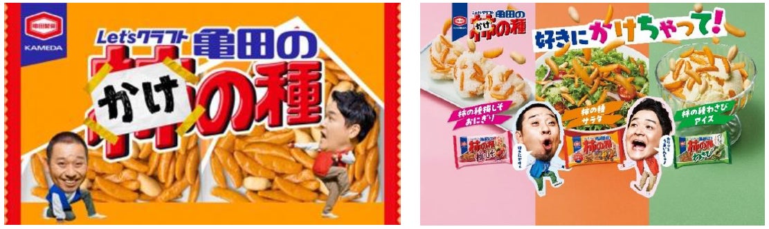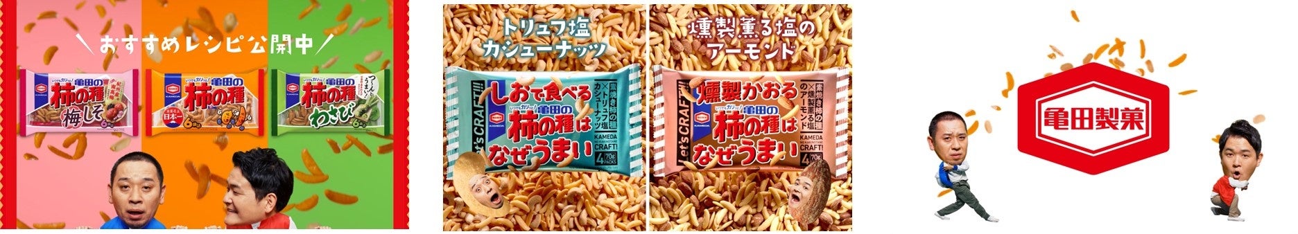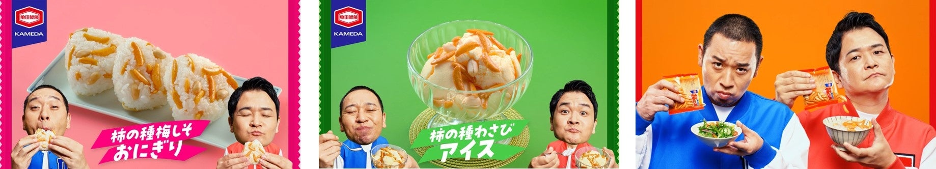 CMでは、『亀田の柿の種』を『亀田の“かけ”の種』に改名し、おなじみの『亀田の柿の種』『亀田の柿の種 梅しそ』『亀田の柿の種 わさび』をサラダやごはん、アイスにかけまくっていきます。第1弾よりパワーアップした別人のようなキレキレなダンスに合わせて、「かけの種」を楽しむ千鳥のお二人に注目です。