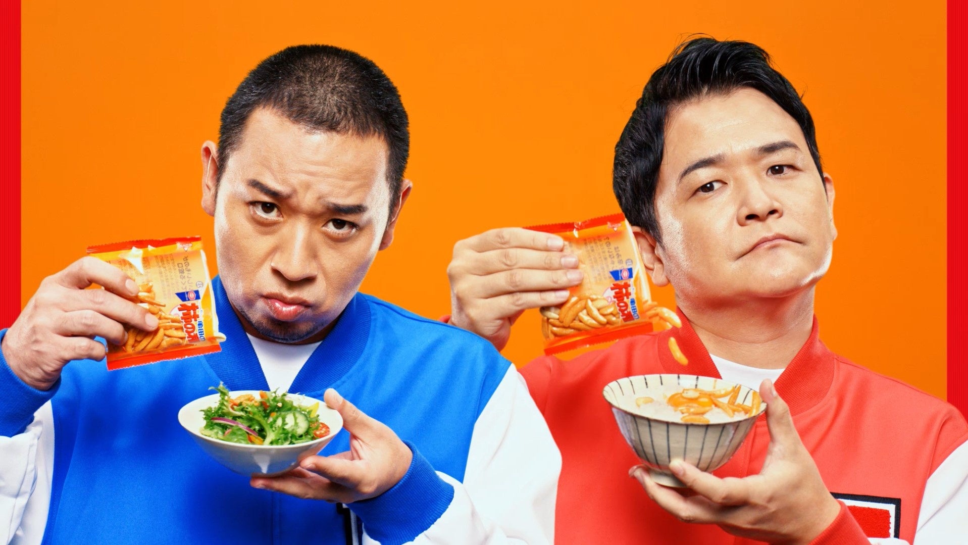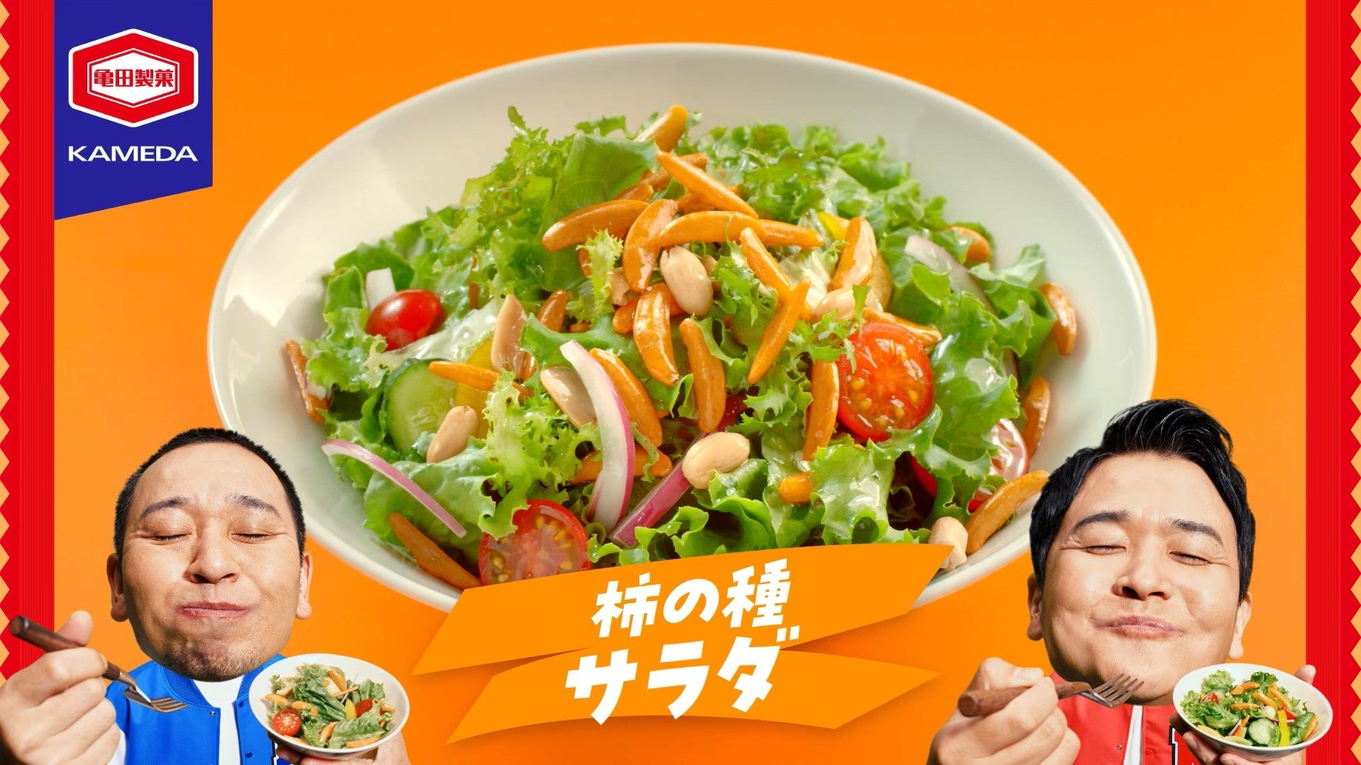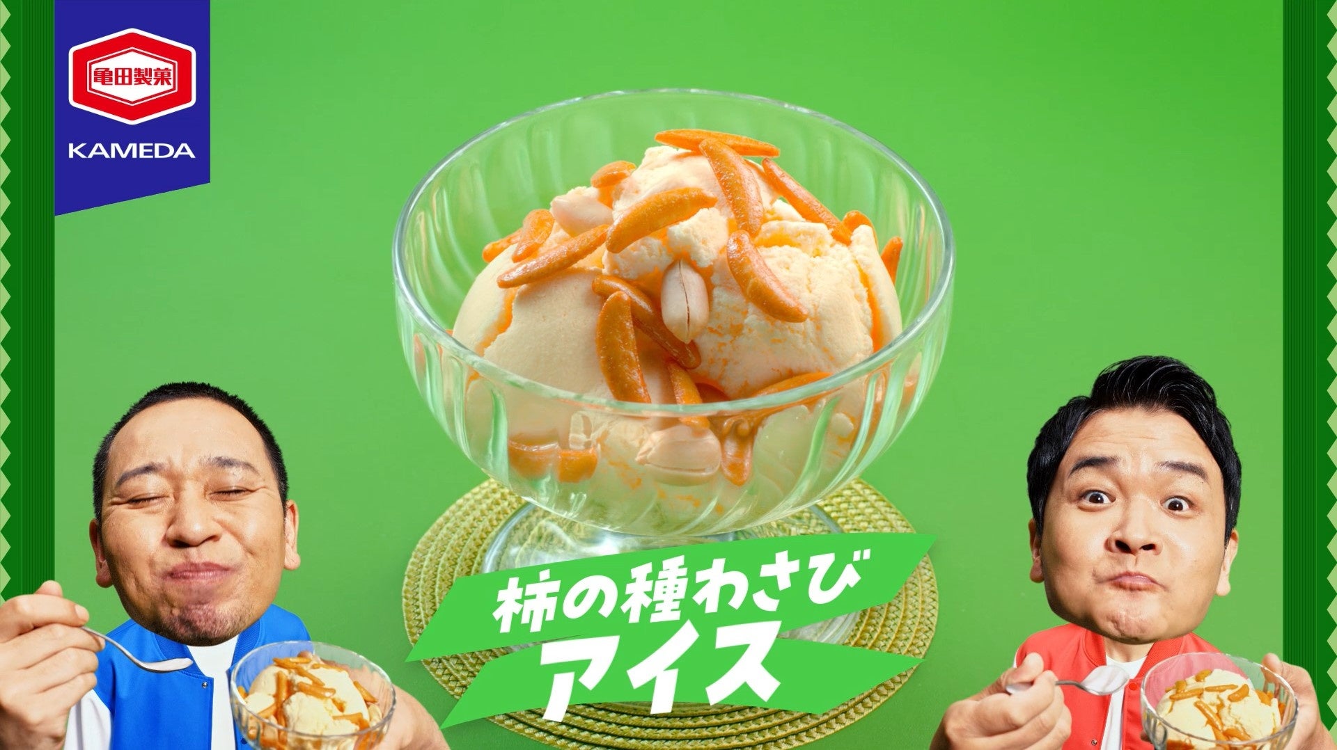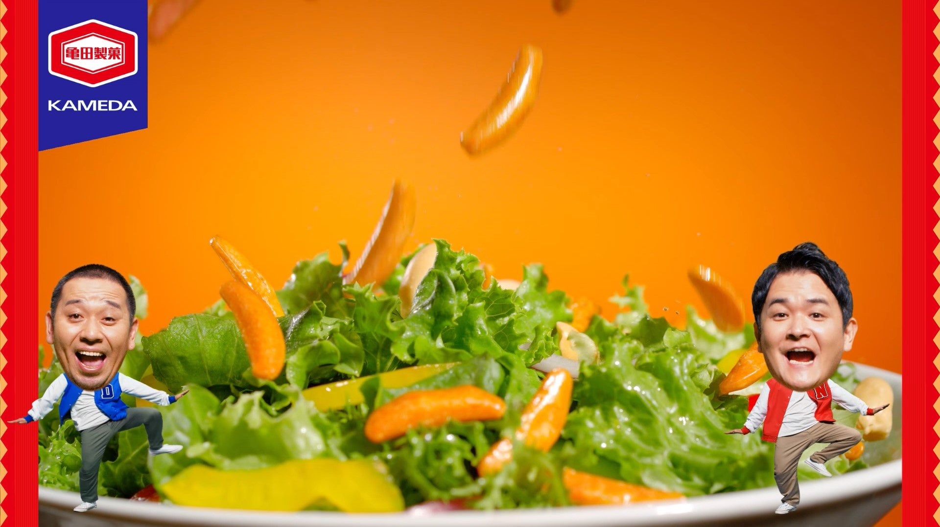 二頭身になった千鳥のお二人が登場する今回のCM。冒頭、“いつもの”『亀田の柿の種』のパッケージを前にした千鳥でしたが、大悟さんが突然「柿」の部分を「かけ」に貼り替えます。「かけの種」の名前にふさわしく、「『亀田の柿の種』×サラダ」や、「『亀田の柿の種 梅しそ』×おにぎり」、「『亀田の柿の種 わさび』×アイス」と、様々な料理に亀田の柿の種を見事なダンスとともに“かけ”、食べていきます。 意外な組み合わせでの美味しさに、感動するお二人の姿が印象的です。
