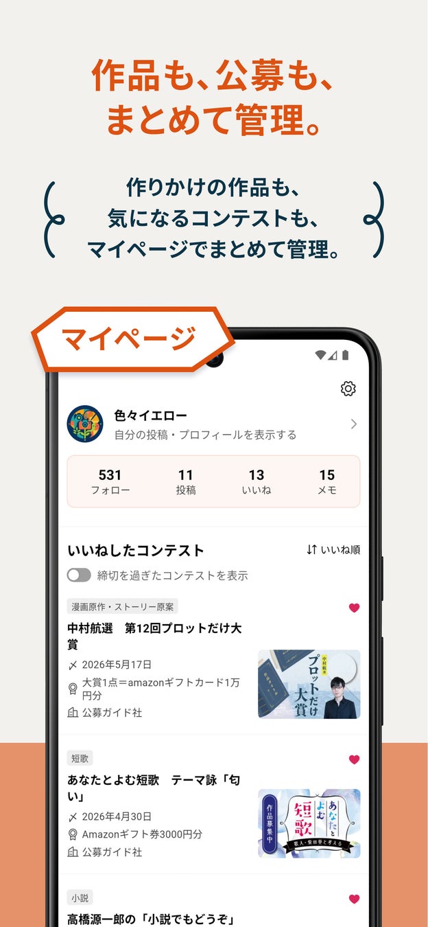 お気に入りのコンテスト、自分の投稿・いいね・メモをまとめて確認。作りかけの作品も気になるコンテストもここで一括管理。