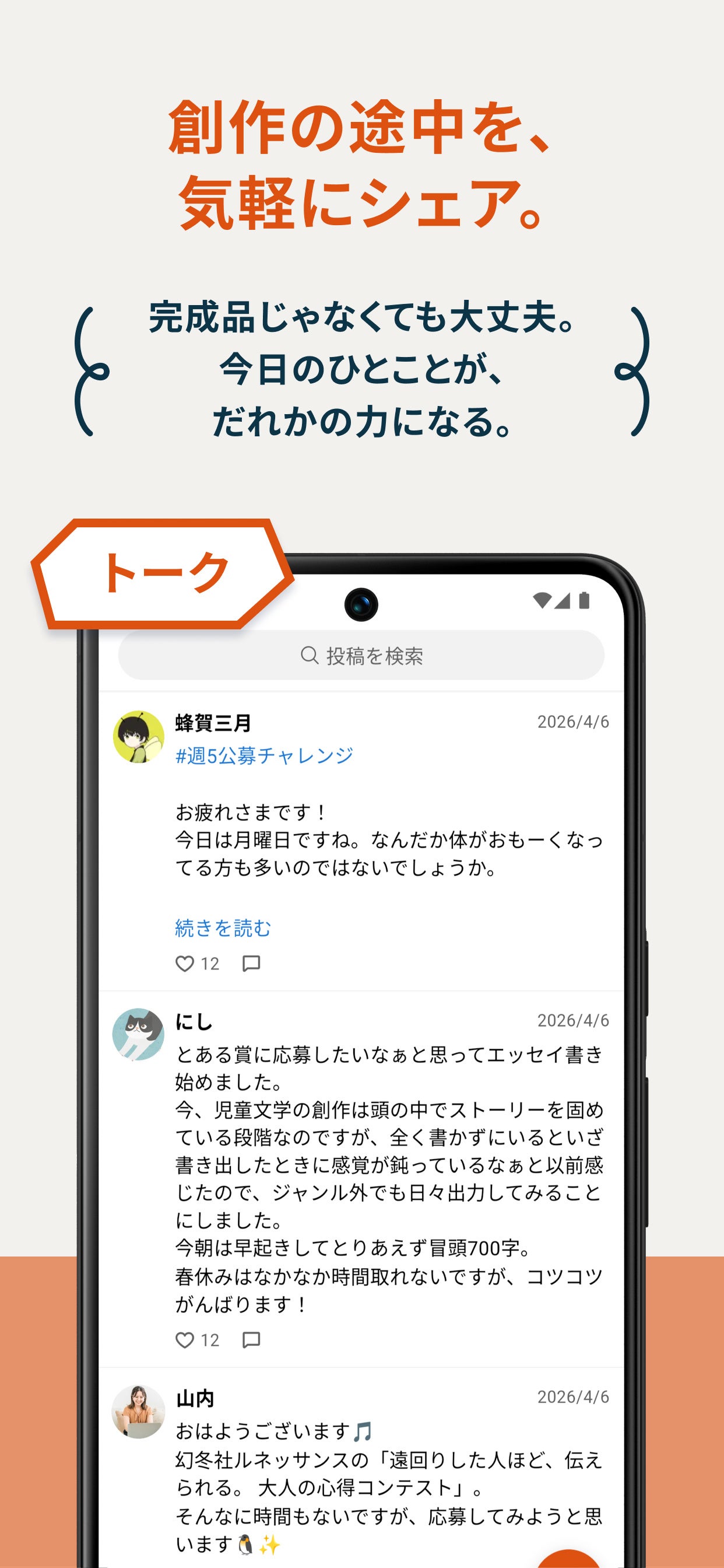 創作は孤独な営みだからこそ、同じように取り組んでいる人がそばにいるだけでやる気が出ます。トークのタイムラインがその役割を担います。