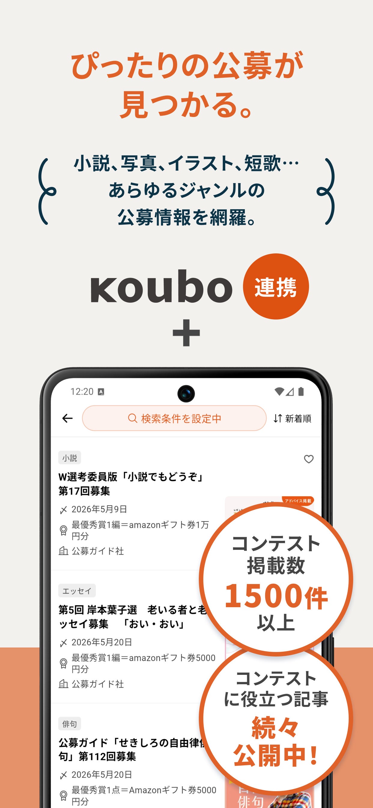 あらゆるジャンルの公募・コンテスト情報を新着順・締切順で一覧表示。お気に入り保存やコメント機能を搭載。コンテスト掲載数は1,500件以上。