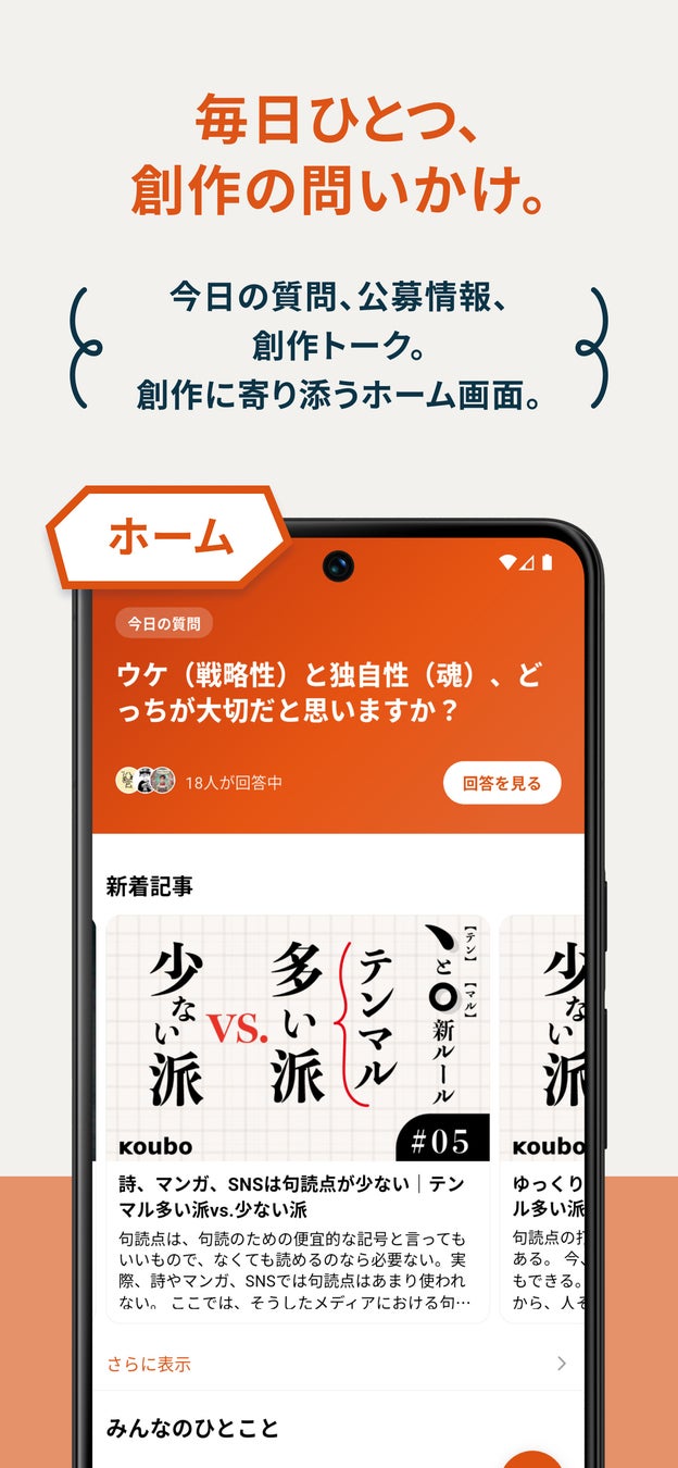 編集部が毎日ひとつ、創作にまつわる問いかけを投稿。ユーザーは回答を投稿したり、他のユーザーの回答を閲覧可能。新着記事やみんなのひとこともホーム画面に集約。