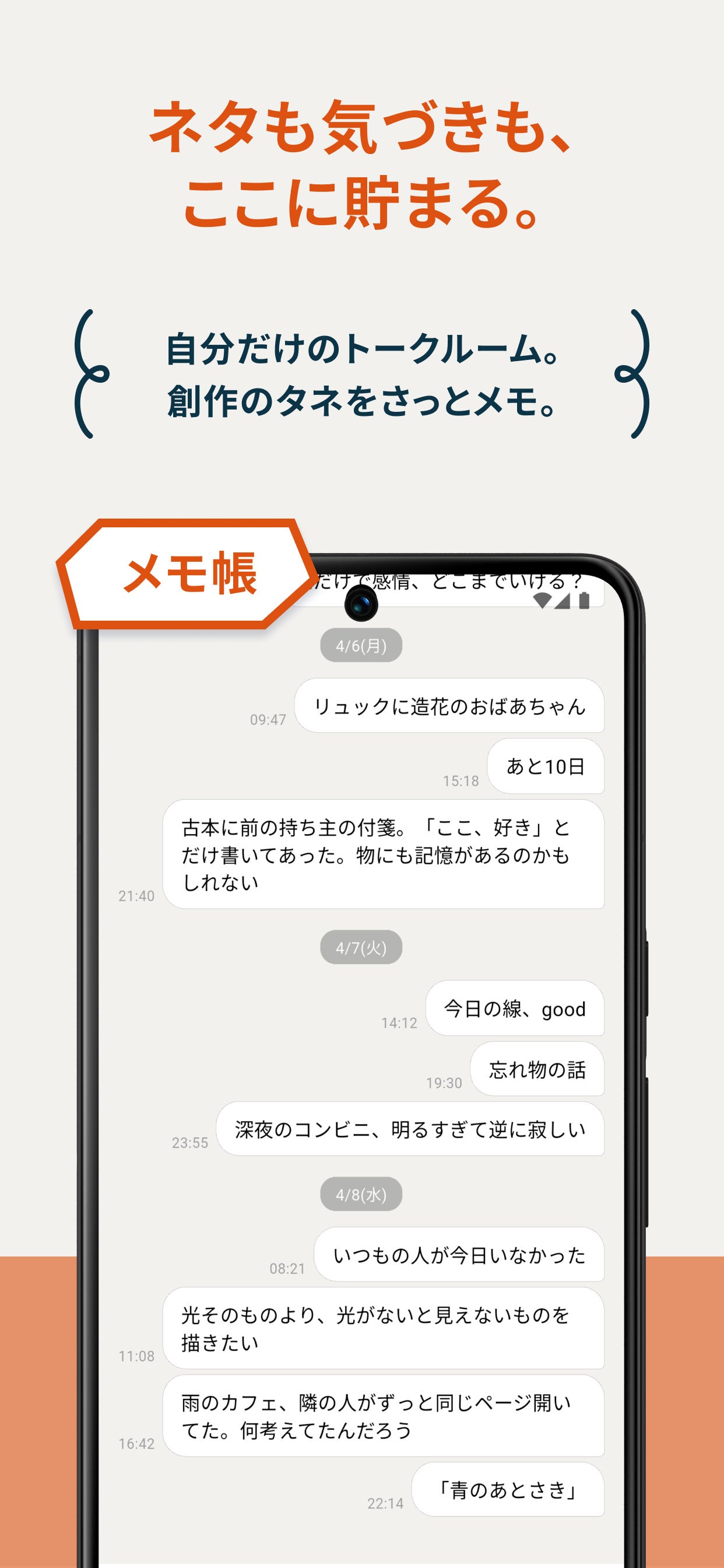 自分だけのトークルーム形式で、テキストメモ・URL保存・写真保存が可能。創作のネタやアイデアを蓄積する個人スペース。