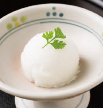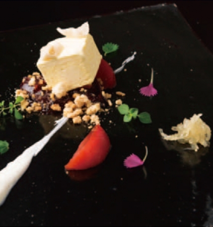 銀座はちみつをパルフェにして、旬のプラム、新生姜をアクセントに1皿に仕上げました。