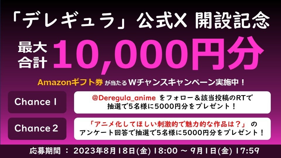アニメレーベル「デレギュラ」公式X開設を記念してキャンペーンを実施!最大1万円分のAmazonギフト券が当たる!