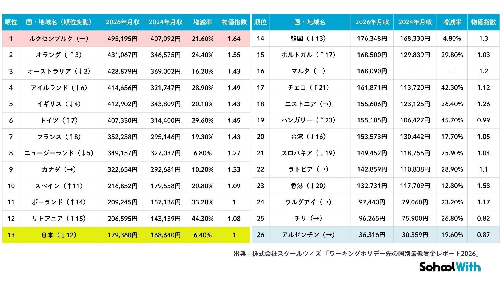 日本最大級の留学メディア/留学エージェント「スクールウィズ」を運営する株式会社スクールウィズ(本社:東京都渋谷区恵比寿、代表取締役:太田英基、以下「スクールウィズ」)は、このたび「ワーキングホリデー先の国別最低賃金レポート2026」を公開しました。