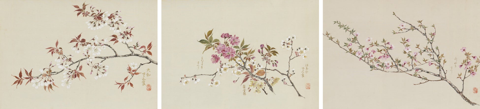 全25面、一つの画面にいくつかの桜の枝が描かれ、それぞれの傍らに金泥で名称が書きこまれている。40種を超える桜が描き分けられており、跡見玉枝(あとみ・ぎょくし)が桜に博物学的な関心を寄せていたことがうかがえる。跡見玉枝は1930(昭和5)年に、恩師の和歌50首に桜50種を描き添えた画帖を皇室に献上。現在は所在の知れないその画帖の絵も、おそらくはこの作品と同類のものだったと考えられている。