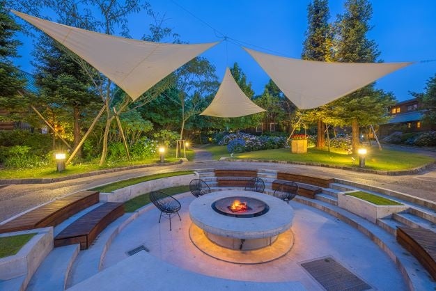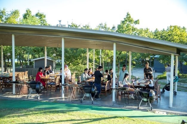 庭の奥には、バーベキュー施設「森とリルのBBQフィールド」。テラスに屋根が付いた全天候型です。
