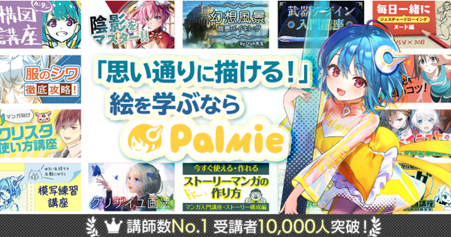 パルミーは、自宅に居ながらイラストやマンガの描き方が学べるオンライン教室です。著名クリエイターや漫画家、アニメーター、専門学校講師など、多くの「プロ」が講師を務めています。月額定額制(サブスク)で授業が受けられる「月謝制」は、累計利用者数10,000名を突破し、順調に利用者数を増やしています。