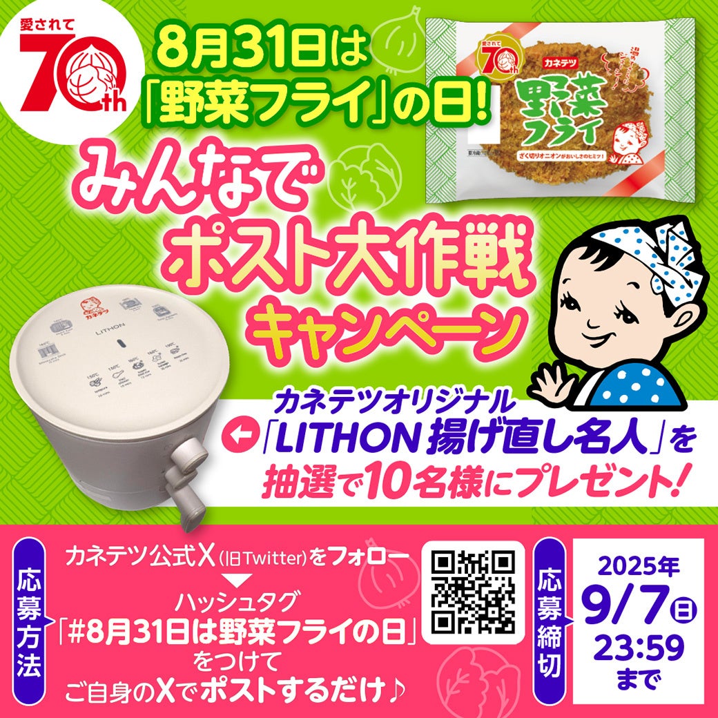 カネテツデリカフーズ株式会社(本社:兵庫県神戸市 代表取締役社長:村上 寛)が販売する“愛されて70周年を迎えたカネテツのロングセラー商品「野菜フライ」”がこのたび日本記念日協会にて8月31日は“「野菜フライ」の日”として認定されました。これを記念して「野菜フライ」の記念日である8月31日を含む応募期間中にご応募いただいた方の中から抽選で10名様に“揚げ物をおいしく温め直しができる調理家電(LITHON 揚げ直し名人)”が当たるSNS(X)キャンペーンを開催いたします。