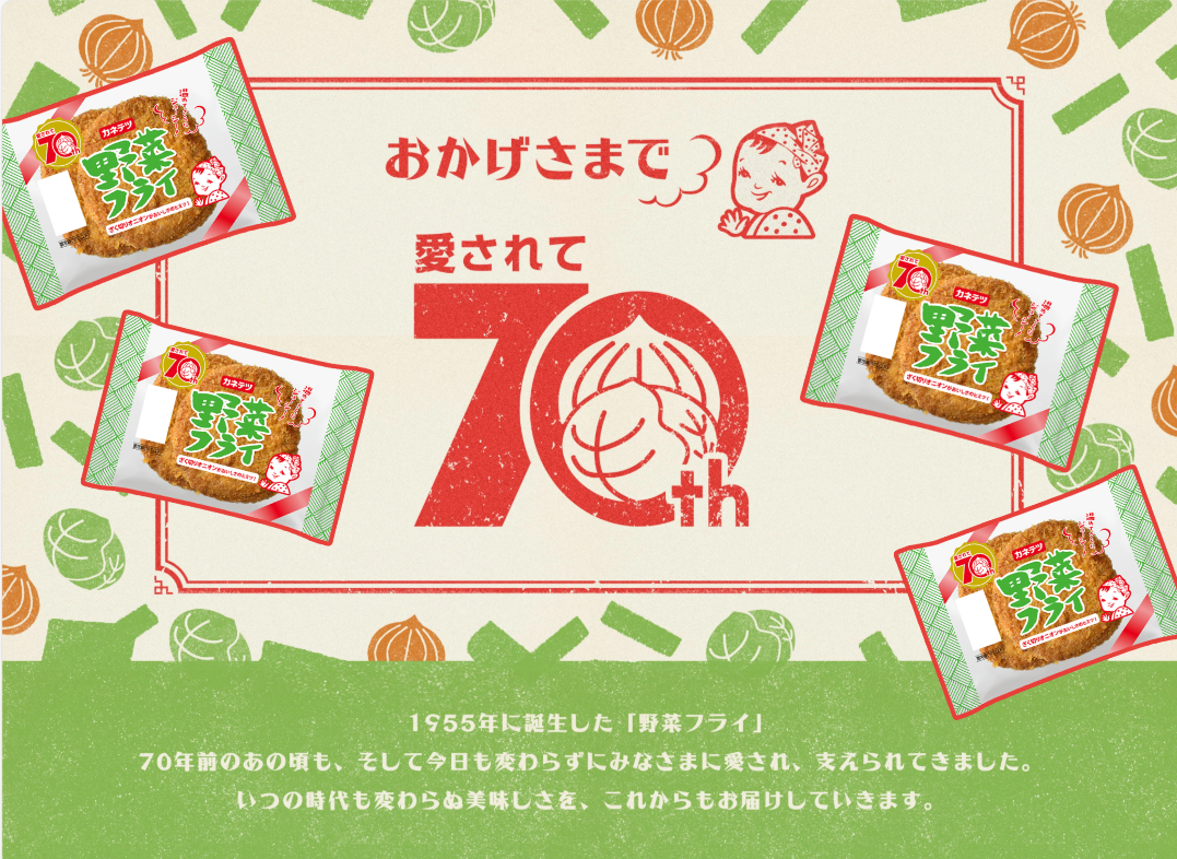 シャキシャキとした野菜の食感を感じる驚きの野菜量(コロッケの約1.5倍)と味わい深い魚のすり身で「野菜フライ」が誕生した70年前のあの頃も、そして今日も変わらぬその美味しさをぜひこの機会にお試しください。