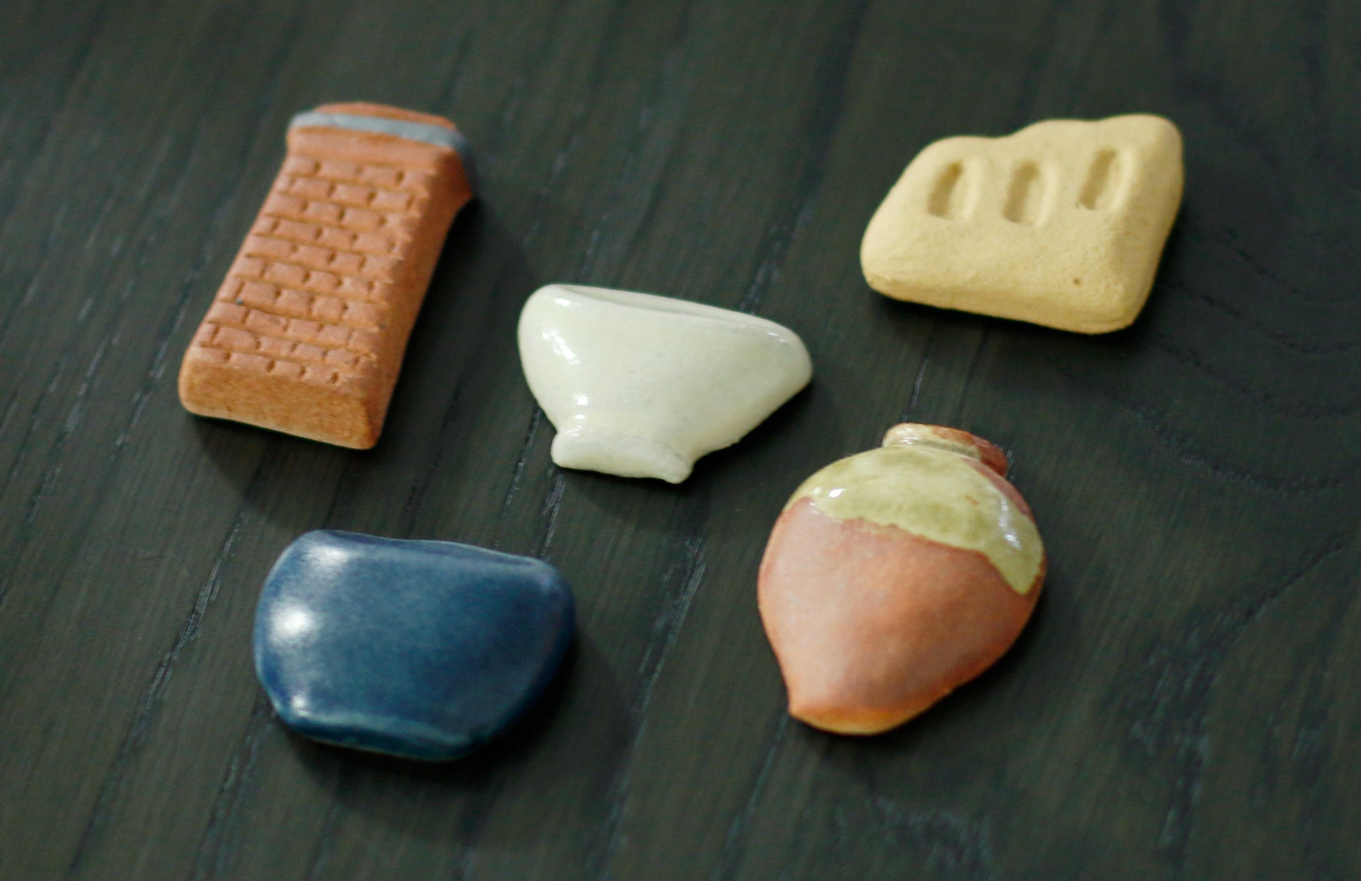 「信楽箸置き」は、“信楽焼を持ち帰る”をコンセプトにしたユニークな一品です。信楽壺や登窯、煙突など、信楽焼の歴史やものづくりを語るうえで欠かせない5つのモチーフがミニチュアサイズで楽しめます。価格:税込2,970円