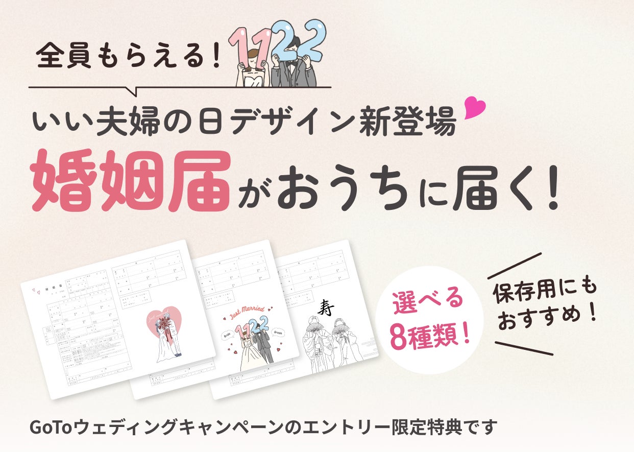 ウェディングニュースでは、「いい夫婦の日(11月22日)」に合わせて、GoToウェディング限定デザイン婚姻届を配布しています。