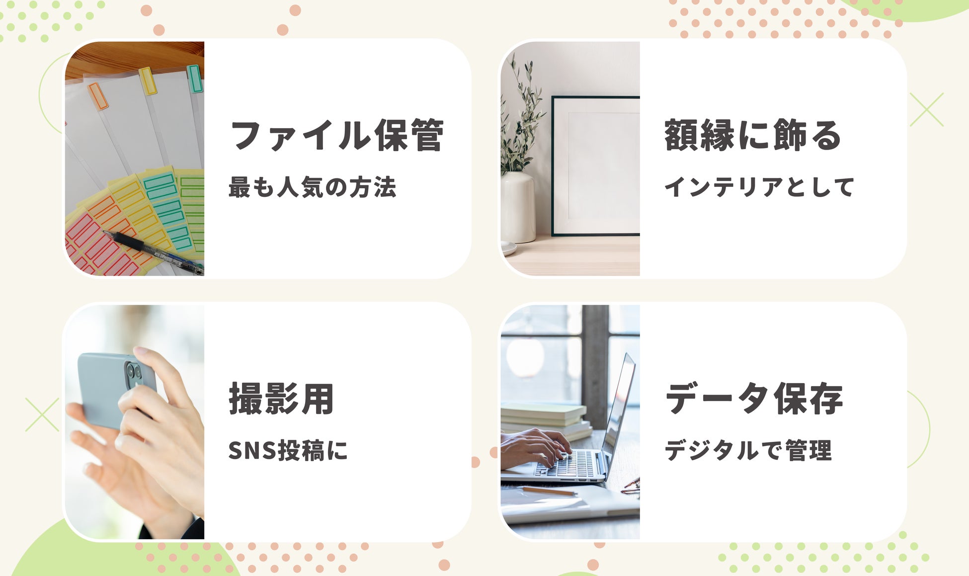 保存方法は「ファイルに保管」が最多で、「額縁に入れて飾る」「アルバムに収納」「写真撮影用としてのみ使用」「データとして撮影して保存」など多様化