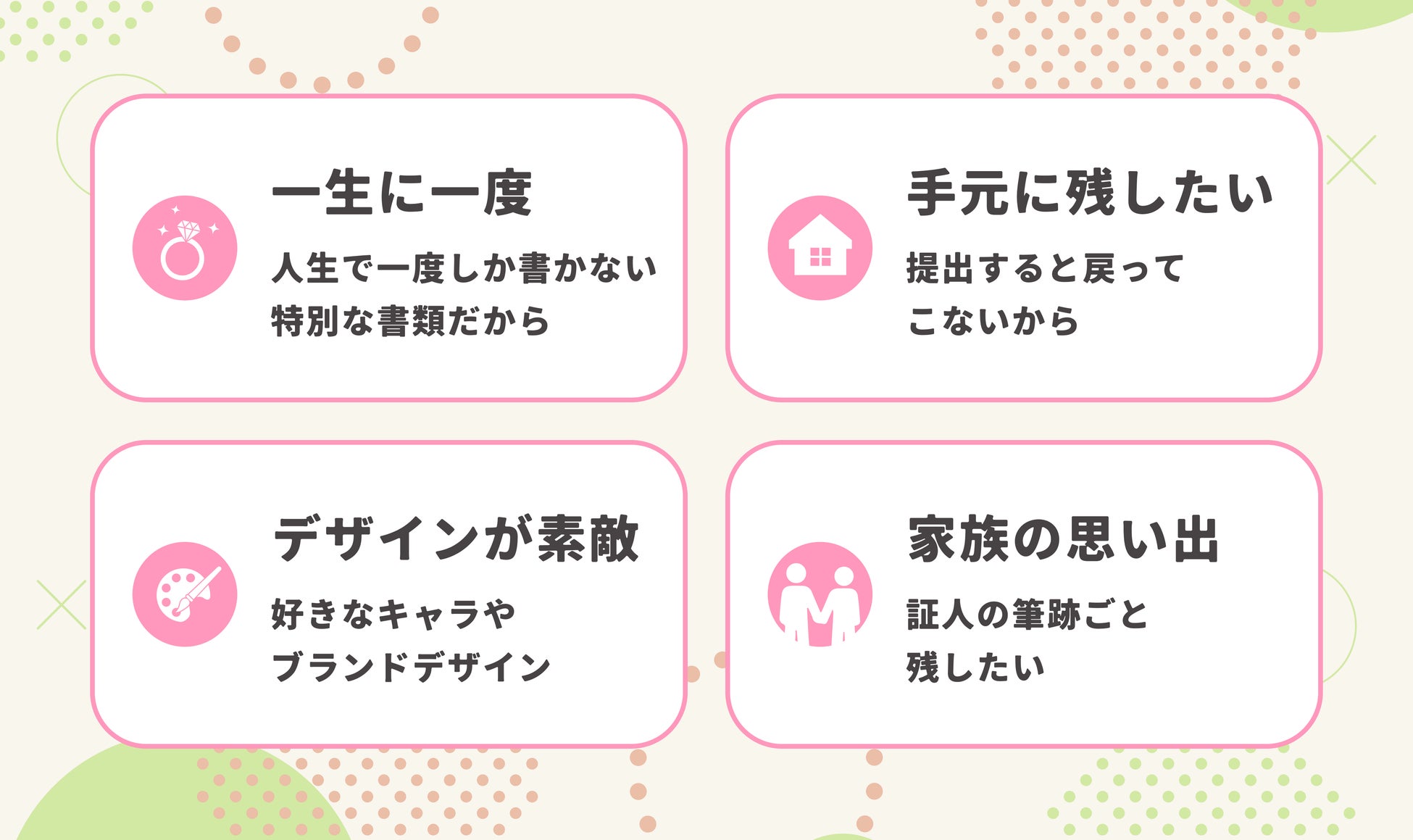 記念保存しようと思ったきっかけは、「一生に一度の思い出」「提出すると手元に残らない」「好きなキャラクター・ブランド・自治体デザイン」「証人欄を家族や友人に書いてもらったから」など