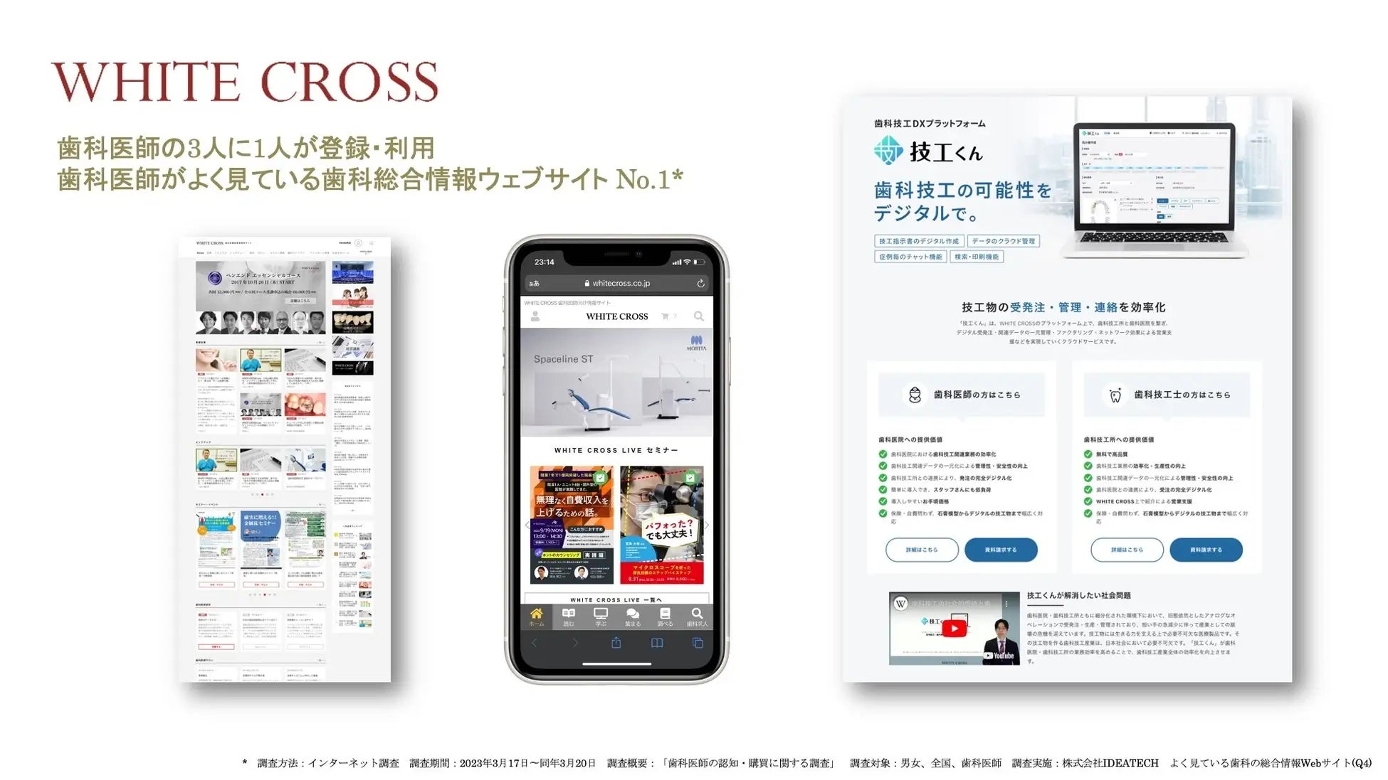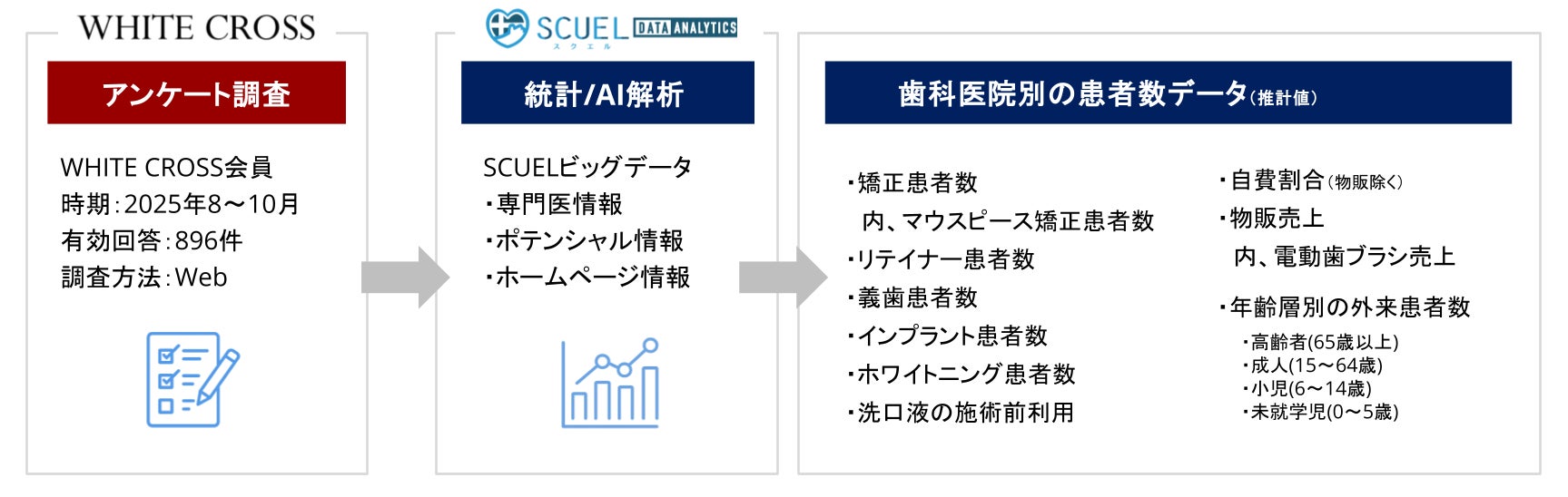 本データは、WHITE CROSS会員である約8.8万人の歯科医療従事者を対象とした約900件のアンケート調査と、全国約6.5万件の歯科医院情報を有するミーカンパニー社の「SCUEL」データベースを組み合わせ、統計解析および機械学習による多層分析を通じて開発されました。