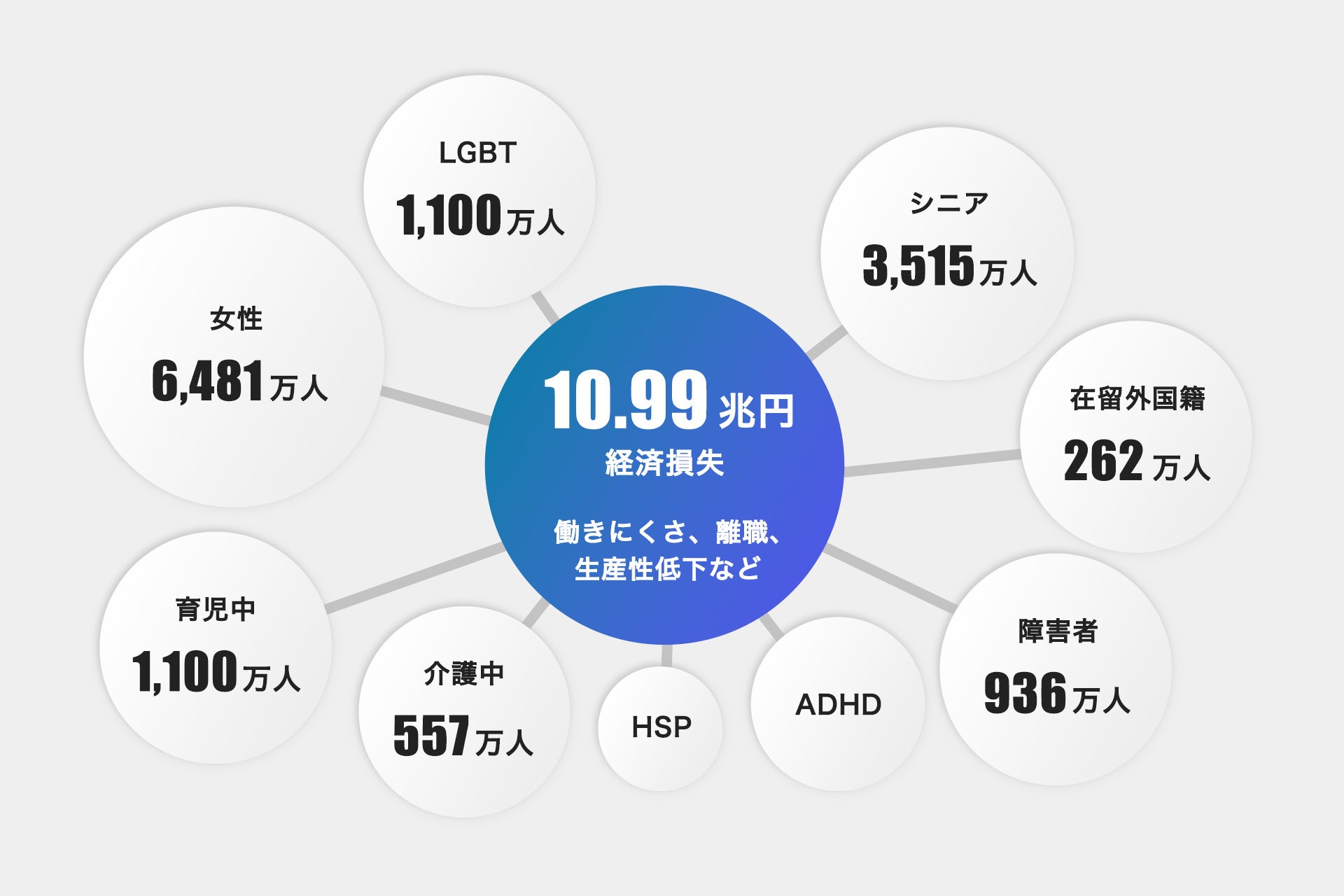しかし、日本の現状は下記の通り。LGBT、シニア、女性、育児・介護、在留外国籍、障害など、さまざまな属性・特徴の方が自分らしく働けず、社会での活躍を妨げられています。その経済損失は約10.99兆円*とも。