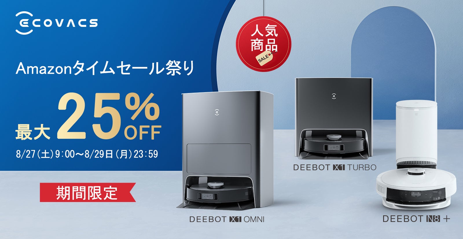 ロボットの研究開発、生産、販売を一体化した家庭用ロボットの総合メーカー・エコバックスジャパン株式会社(東京都品川区/代表取締役社長 坂梨文康)は、8月27日(土)9:00から8月29日(月)23:59までAmazon.co.jpで開催される「タイムセール祭り」に参加、人気製品が最大25%OFFとなる特別セールを実施いたします。